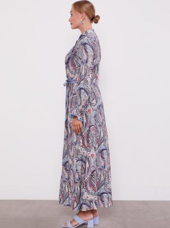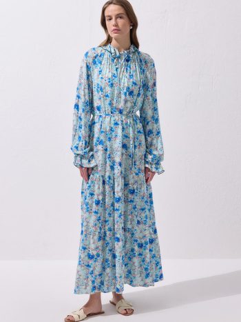 فستان ديان الطويل المزخرف من القماش الفسكوزي باللون الأزرق هو الخيار المثالي الذي يجسد خفة وأناقة الصيف. نسيج الفسكوزي الناعم