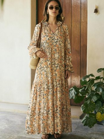 فستان ديان الفيسكوز الطويل المموج باللون البرتقالي الناعم هو الخيار المثالي لتجسيد خفة وأناقة الصيف. نسيج الفيسكوز الناعم وخفة وزنه
