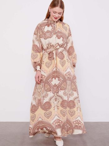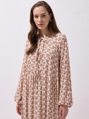 فستان فلور طويل من الفيسكوز مع ربط عند الخصر باللون البني