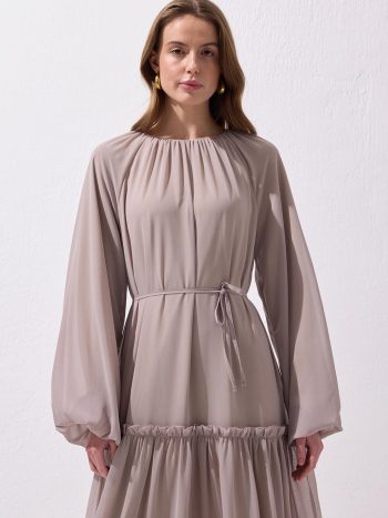 فستان جولي الطويل بلون الفيزون، مصنوع من قماش الشيفون متعدد الطبقات، ويوفر راحة طوال اليوم بفضل خفته وقدرته على التنفس.