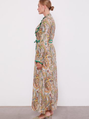 فستان أخضر مزخرف بتفاصيل كشكشة ورسومات عرقية