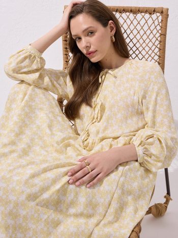 وصف المنتج فستان فلور فيسكوز طويل مربوط باللون الأصفر يقدم لك الراحة طوال اليوم بقماش الفيسكوز الخفيف والتنفس، بينما تضيف