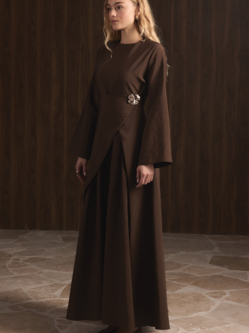 فستان كوبرو مزين بدبوس أمامي من زوي – لون القهوة