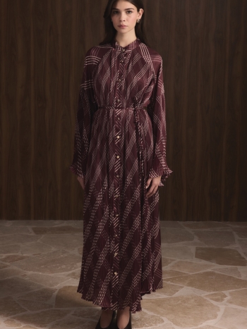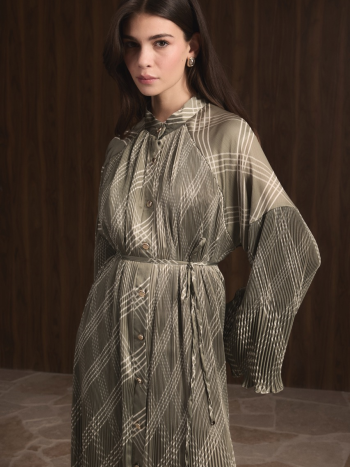 يتميز هذا الفستان المصنوع من قماش الساتان المطوي بتصميم أنيق وجذاب، مما يجعله الخيار المثالي للمناسبات الخاصة. يجمع بين راحة