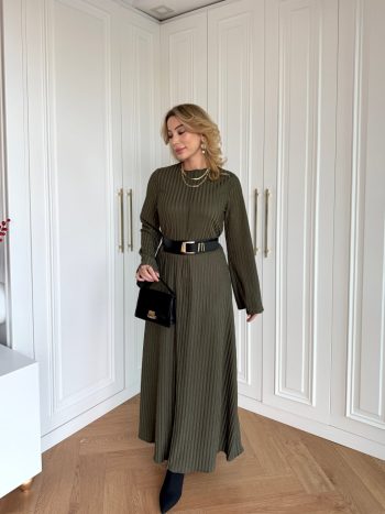 الفستان مصنوع من قماش تريكو متماسك من الدرجة الأولى بتأثير لامع. يتميز بتفصيل حزام قابل للإزالة. تصميم ياقة الدراجة مع