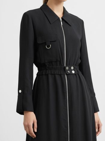 فستان طويل نسائي بقلب قميص وسحاب وحزام من الخصر – 12667 – أسود