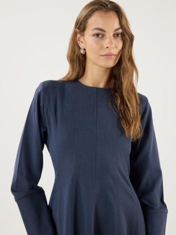 فستان أزرق بحري متسع من الأسفل بأكمام واسعة