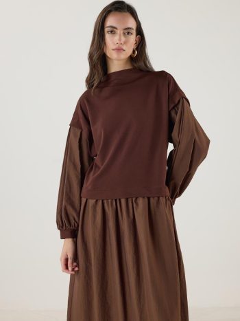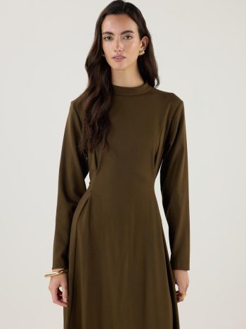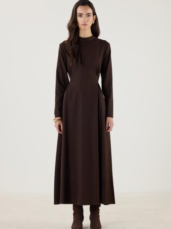 فستان ذو ياقة عالية وطيات مزدوجة – بني قهوة مر