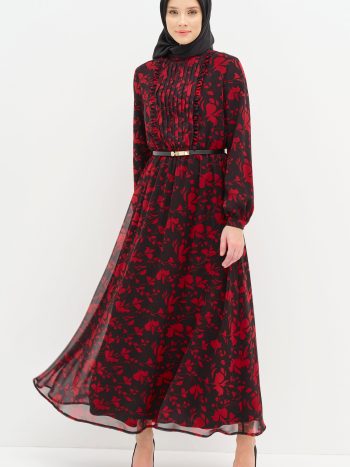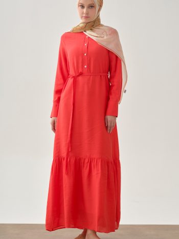 فستان مزين بالكسرات والكشكشة – أحمر