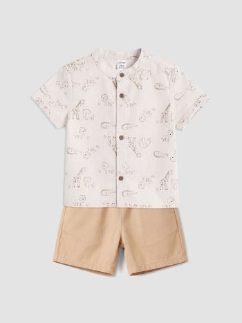 ست قميص وسروال قصير للرضع الذكور بلون البيج وطبعة حيوانات
