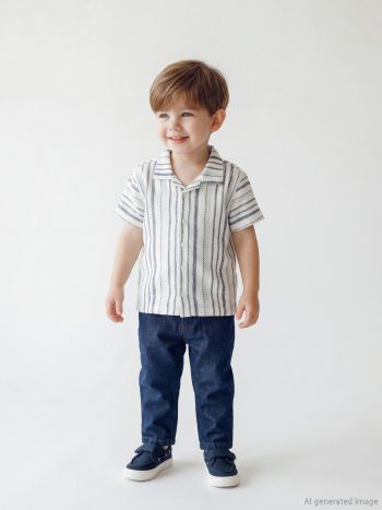 طقم بيبي صبي بقميص قصير الأكمام وسروال بلون الكريمي الفاتح