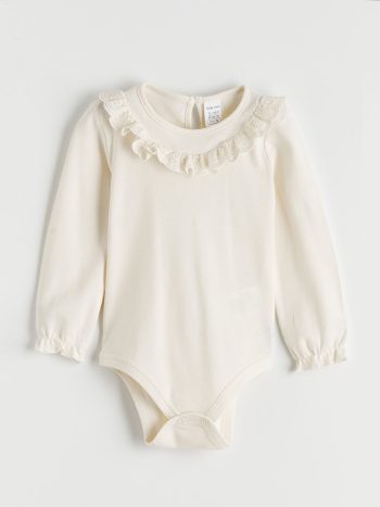 بدلة رضّع بنات بلون البيج بتفاصيل كشكشة عند الياقة ورباطات
