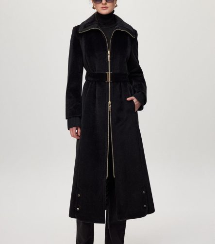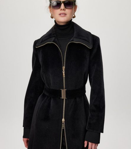معطف أسود فروي بتفاصيل سحاب وحزام 14000