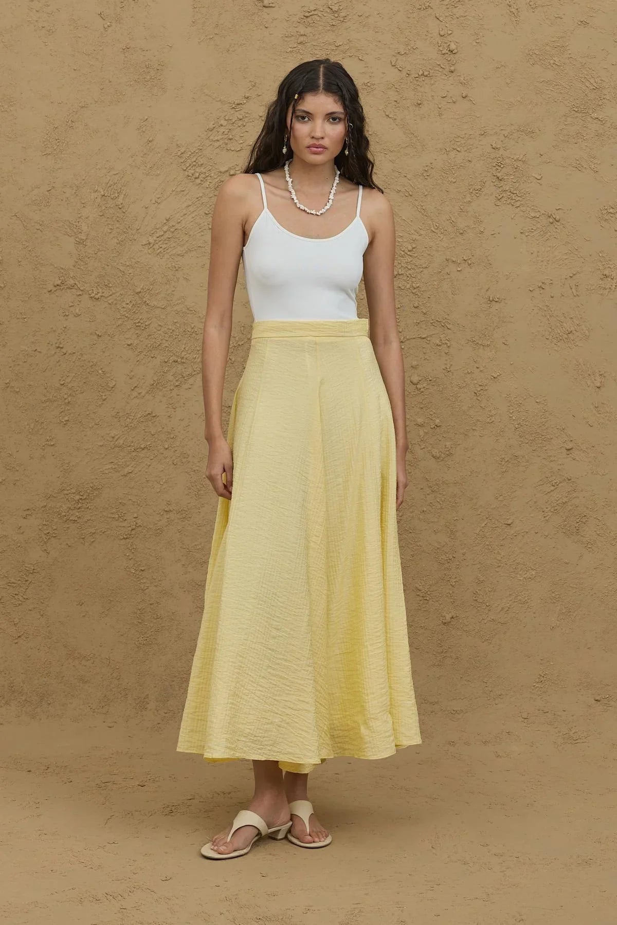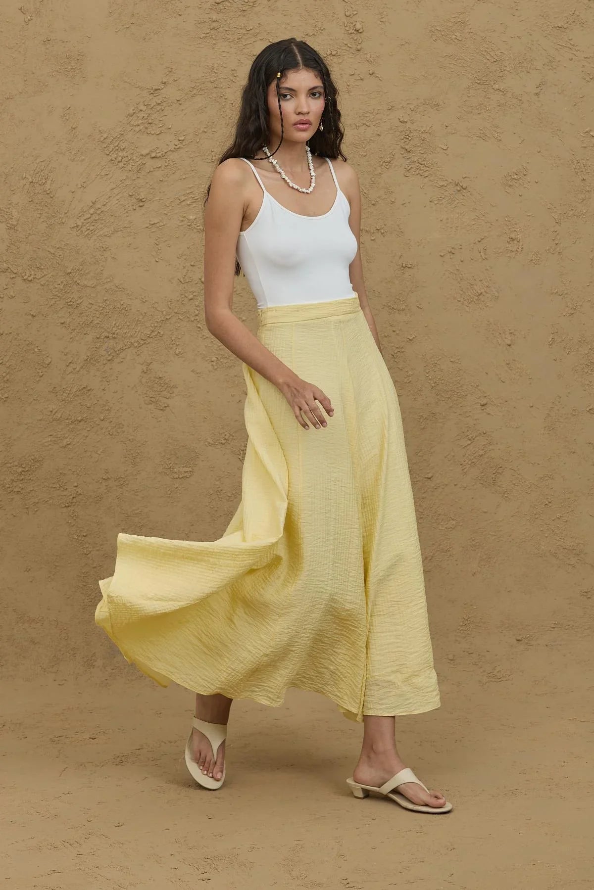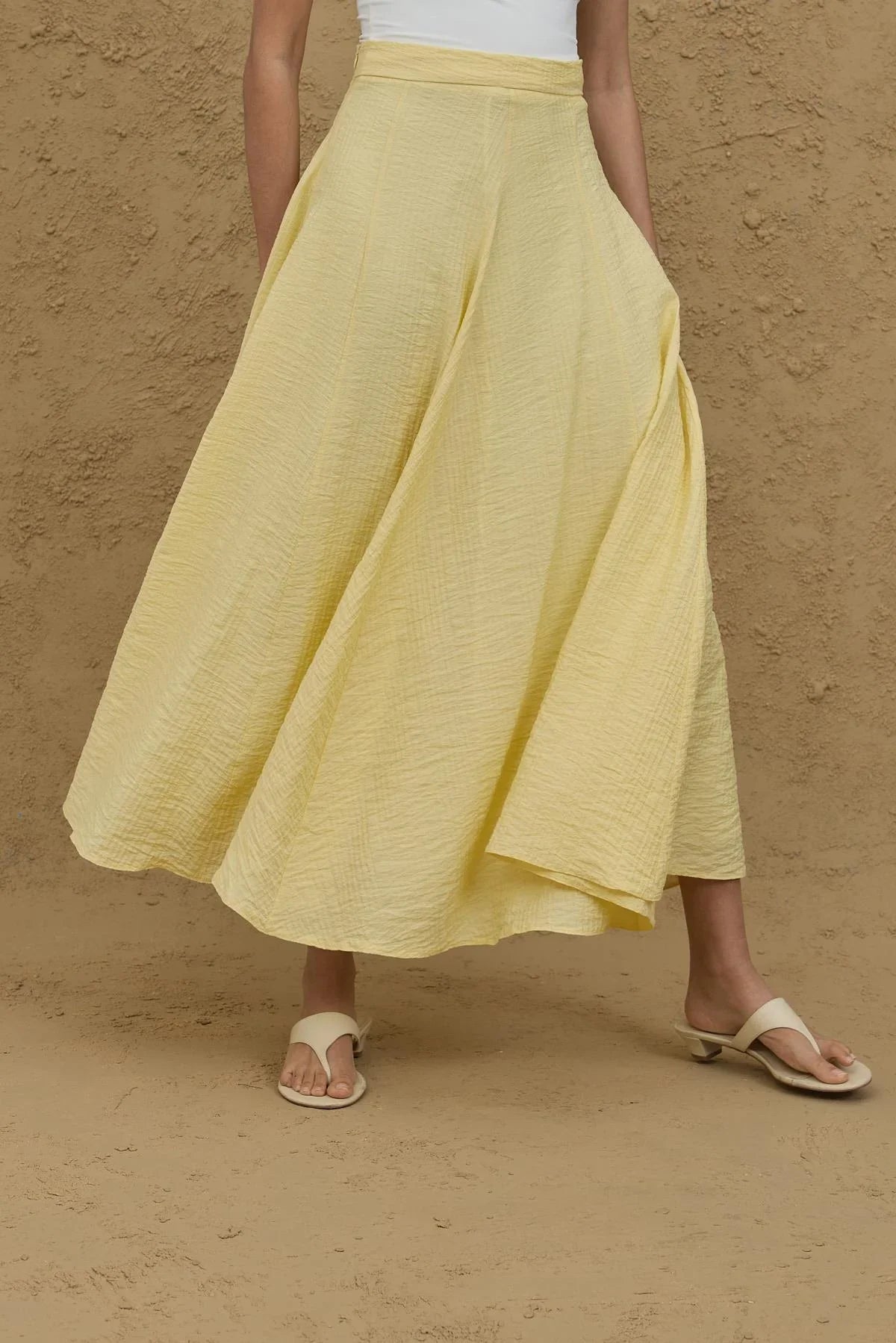 تتميز بخصر مسطح مع حزام، إغلاق بسحاب، وطبقات متموجة، هذه التنورة مصنوعة من نسيج ناعم ومبطنة وبطول ماكسي.