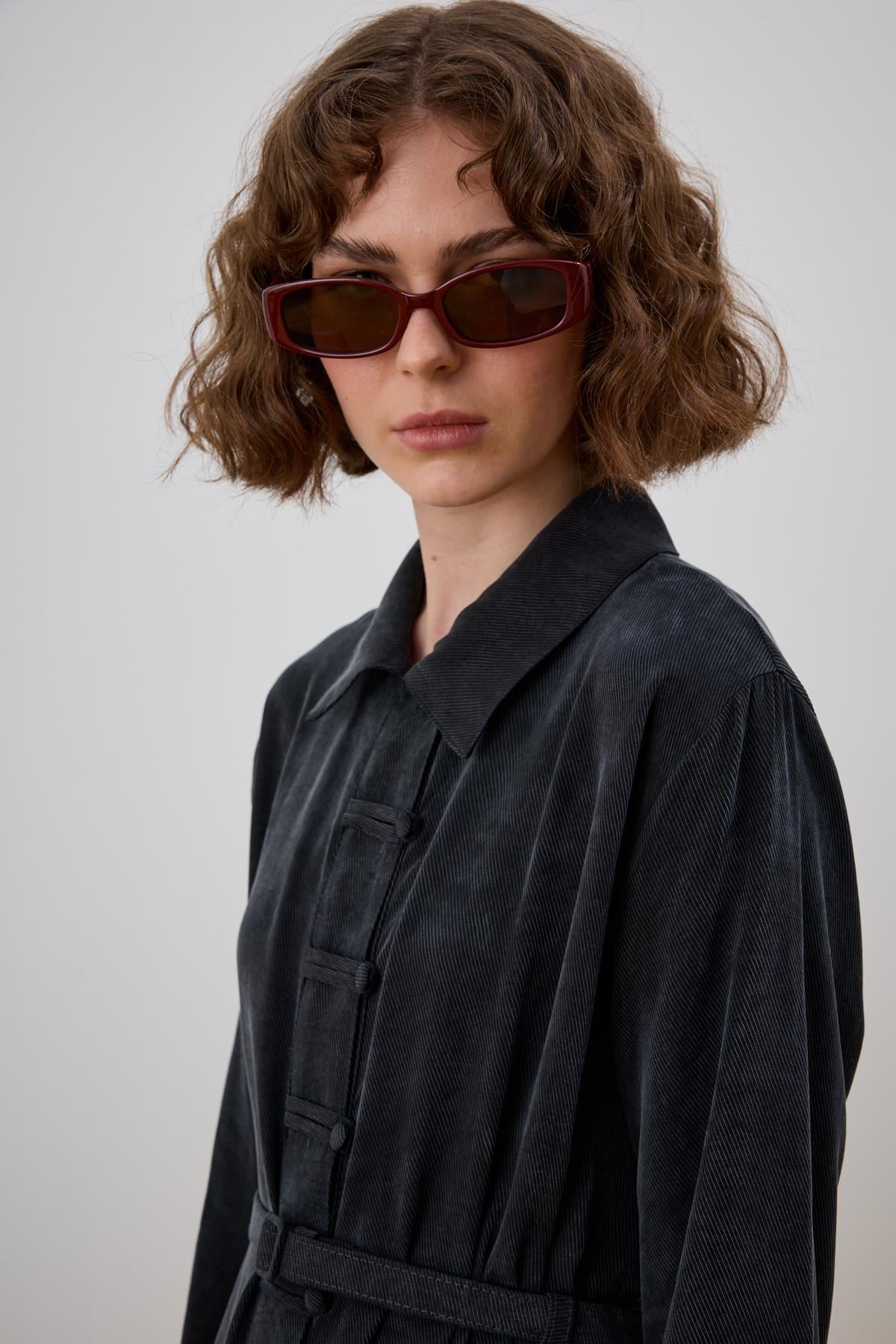 تونيك طويل ذو ياقة قميص مع إغلاق أمامي بأزرار بريتلي، وحزام مغطى بالقُماش، وجيب واحد.