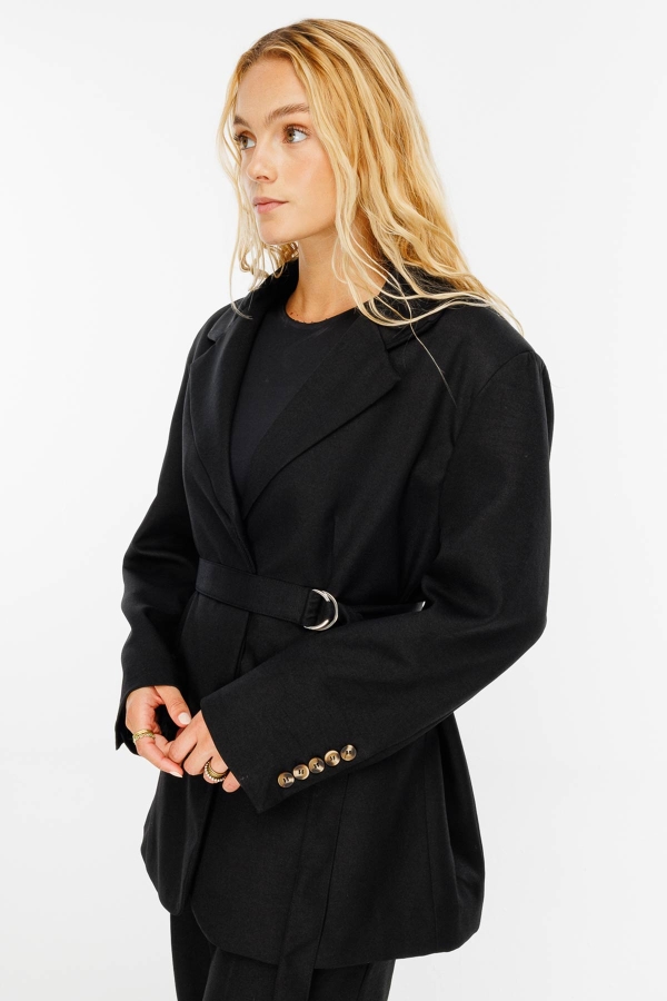 جاكت بليزر مصنوع من نسيج منسوج متميز، بإغلاق بأزرار مخفية من الأمام، ياقة جاكت، جيوب أمامية مزخرفة، مزود بإكسسوارات مشبك D من نفس القماش، تصميم مريح ومبطن.