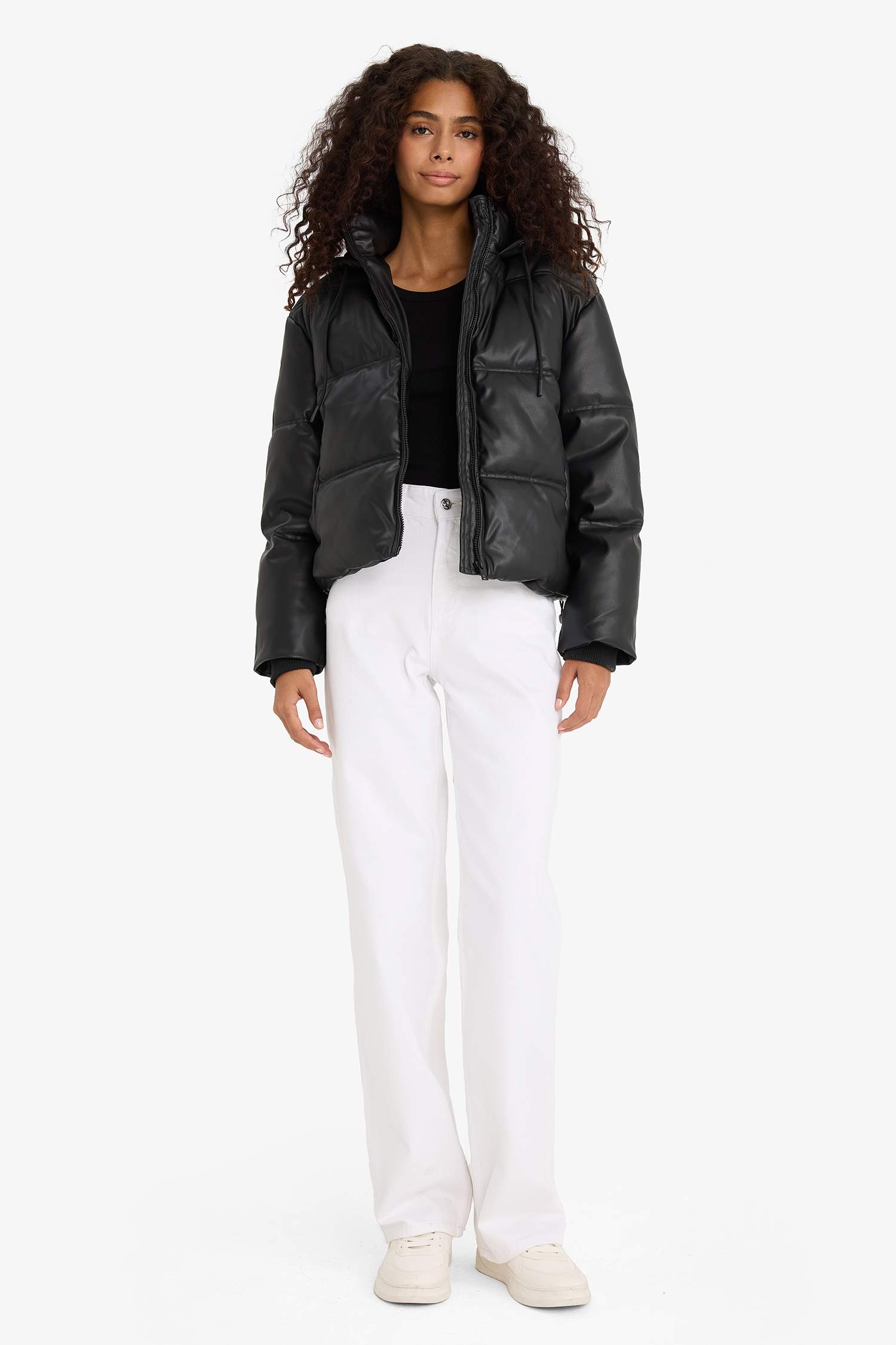 جاكيت جلد صناعي مقنع مبطّن بالقطيفة بقصّة منتظمة