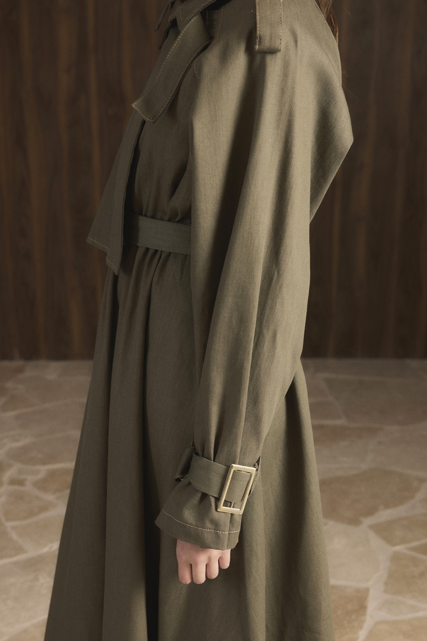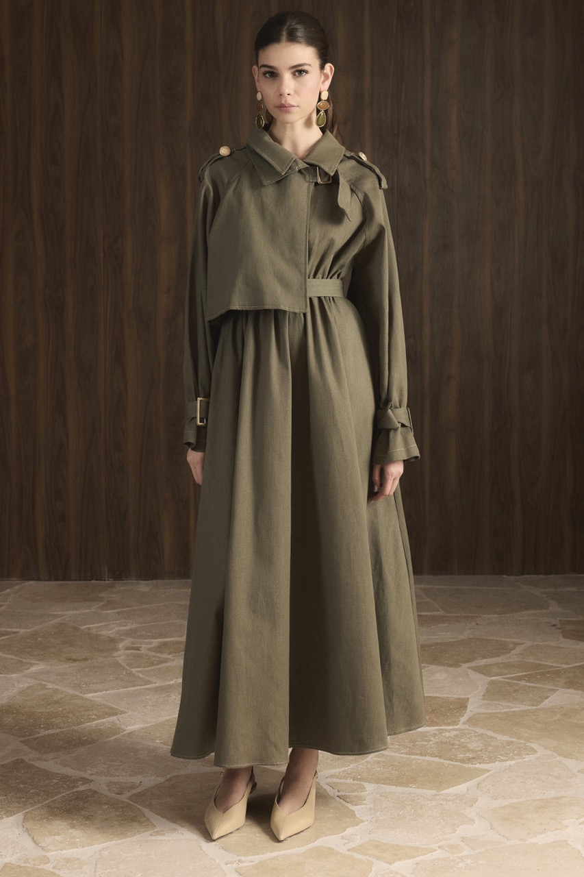يبرز هذا الفستان الطويل بتصميم أنيق وتفاصيل عصرية، حيث يظهر وقفة مثالية بفضل قماش الترينش المتين والمرن في الوقت نفسه. تضيف التفاصيل المطوية في المقدمة حركة للتصميم، بينما يؤكد خط الخصر مع الحزام على منحنيات الجسم بأناقة. بطوله الكامل وتصميمه البسيط، يقدم خياراً أنيقاً للمناسبات الخاصة وللستايل الحضري.