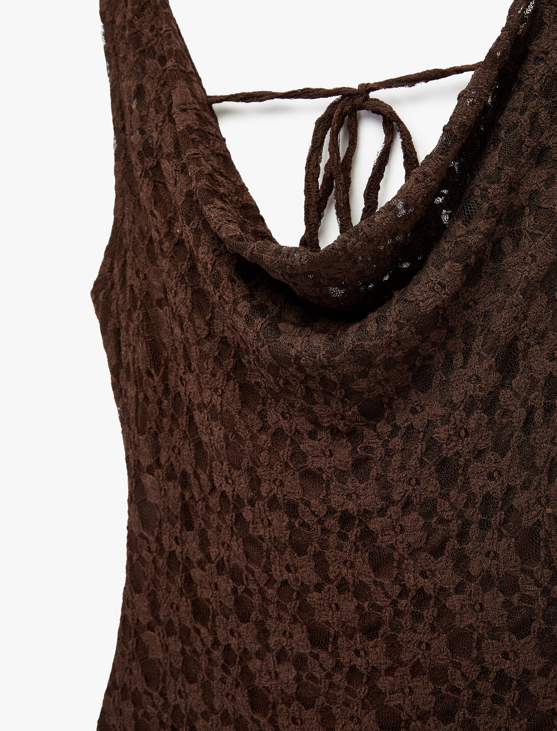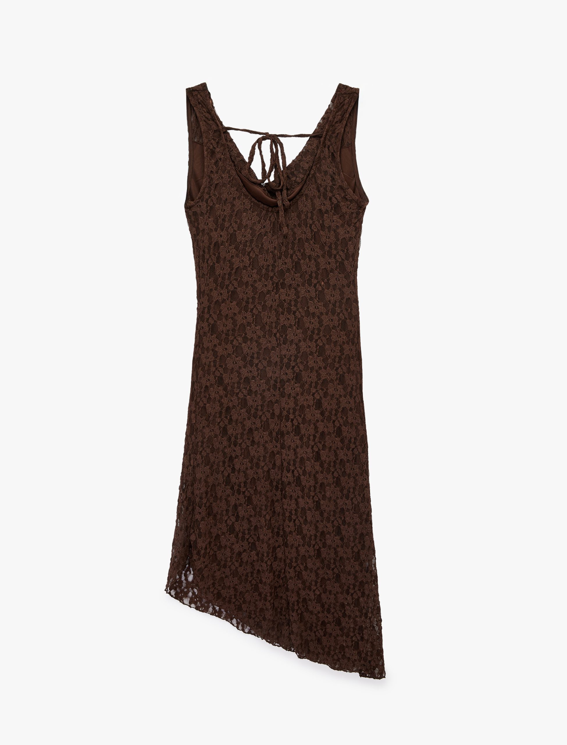 فستان ميدي من الدانتيل بأكمام غير موجودة ورقبة واسعة وتصميم غير متماثل