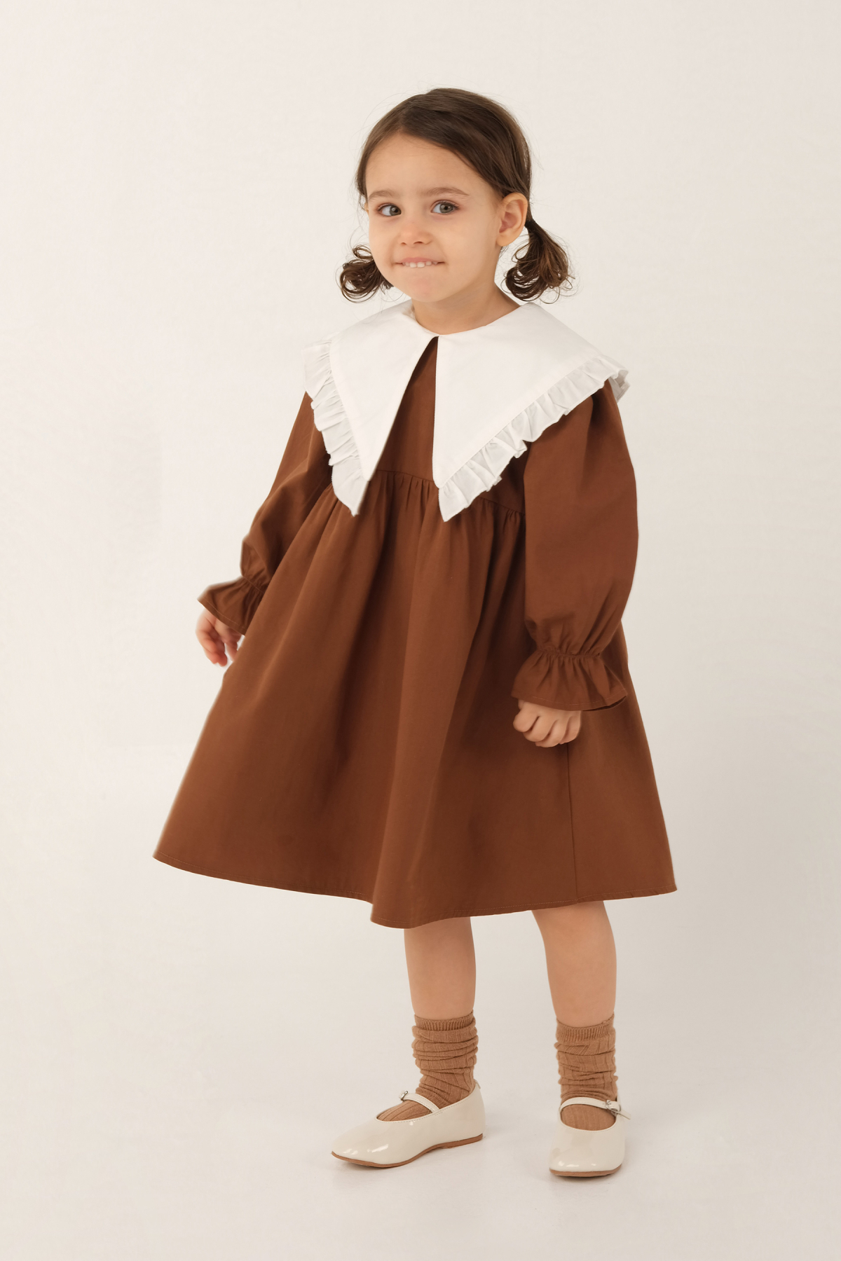فستان قهوة 9441-E بقماش ناعم وتفاصيل مضلعة وتنورة متموجة