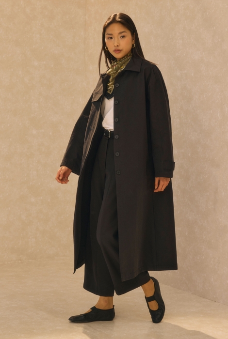 معطف ترينتش طويل بتفاصيل جيب واحد باللون الأسود