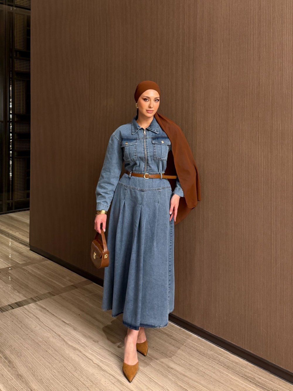 Tags: casual fashion, jacket and skirt combo, light blue denim set, matching set, women's outfit