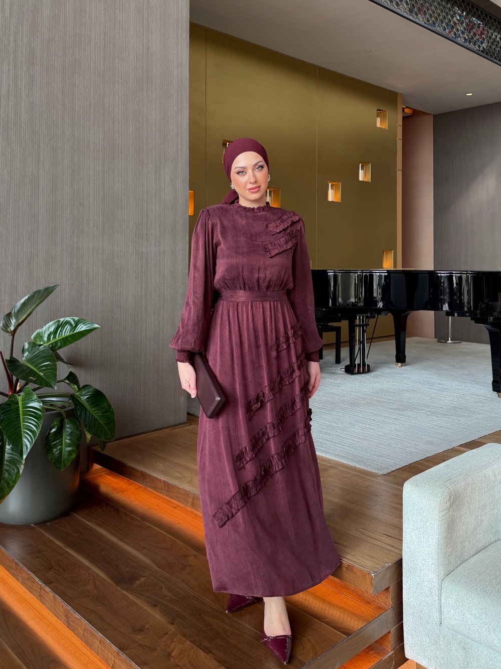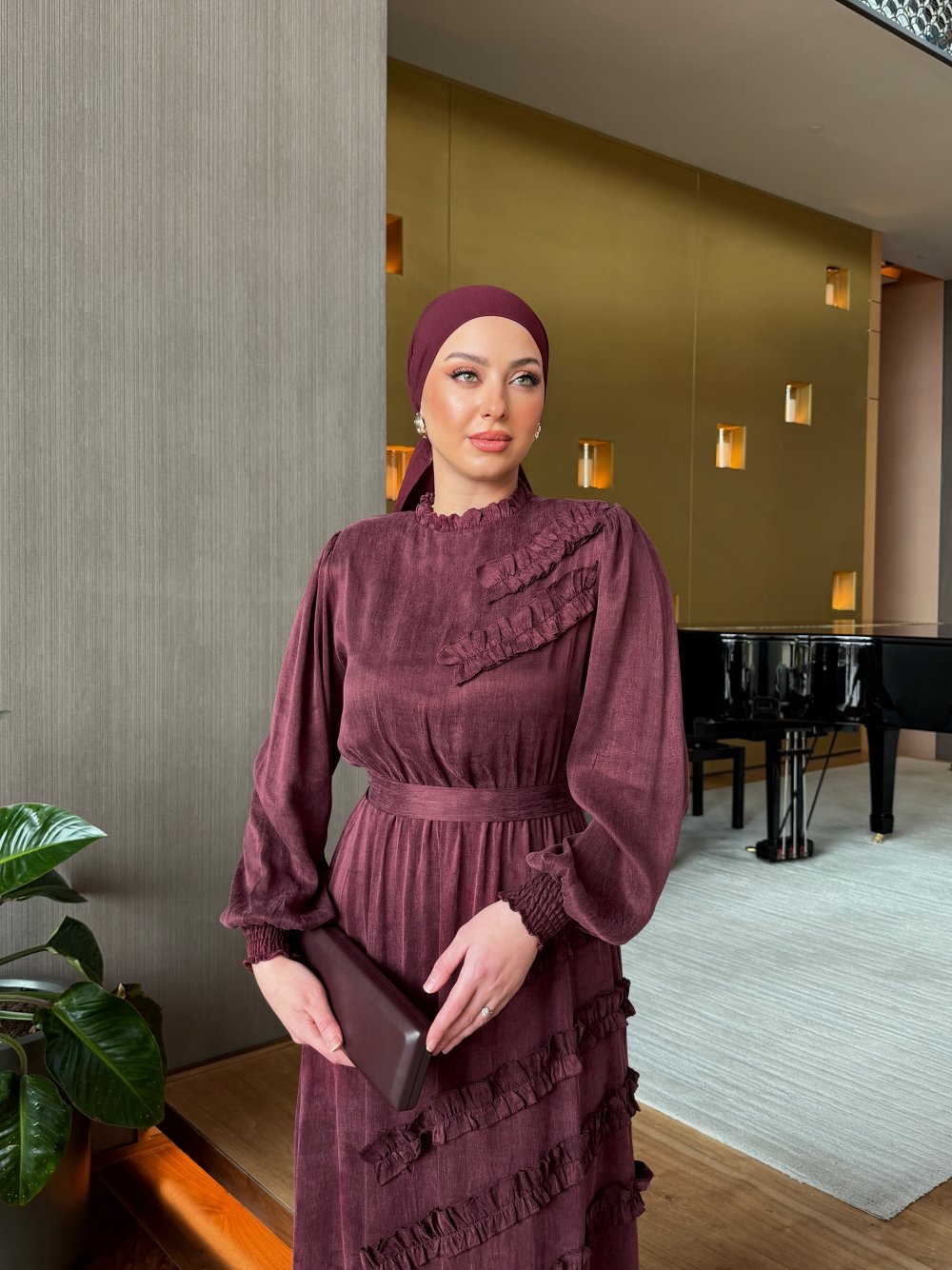 Kol Volanlı Allerli Şifon Ekose Elbise – Mürdüm
