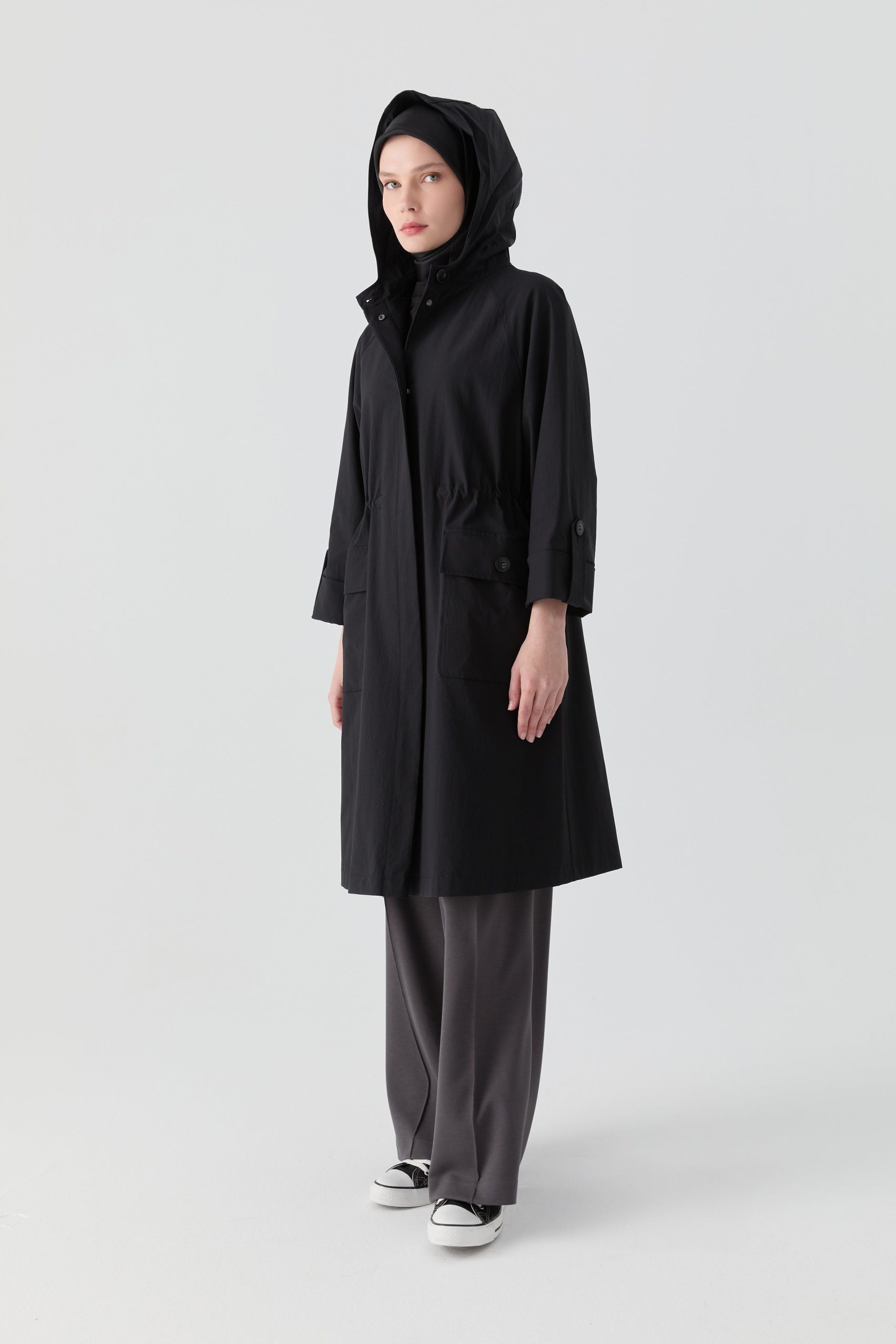 Bu şık kap, duble kol bant detaylarıyla klasik tasarımlara modern bir dokunuş ekliyor. Orta uzunluktaki kesimi ve belden hafifçe oturan formu, vücut hatlarını nazikçe belirginleştirir.