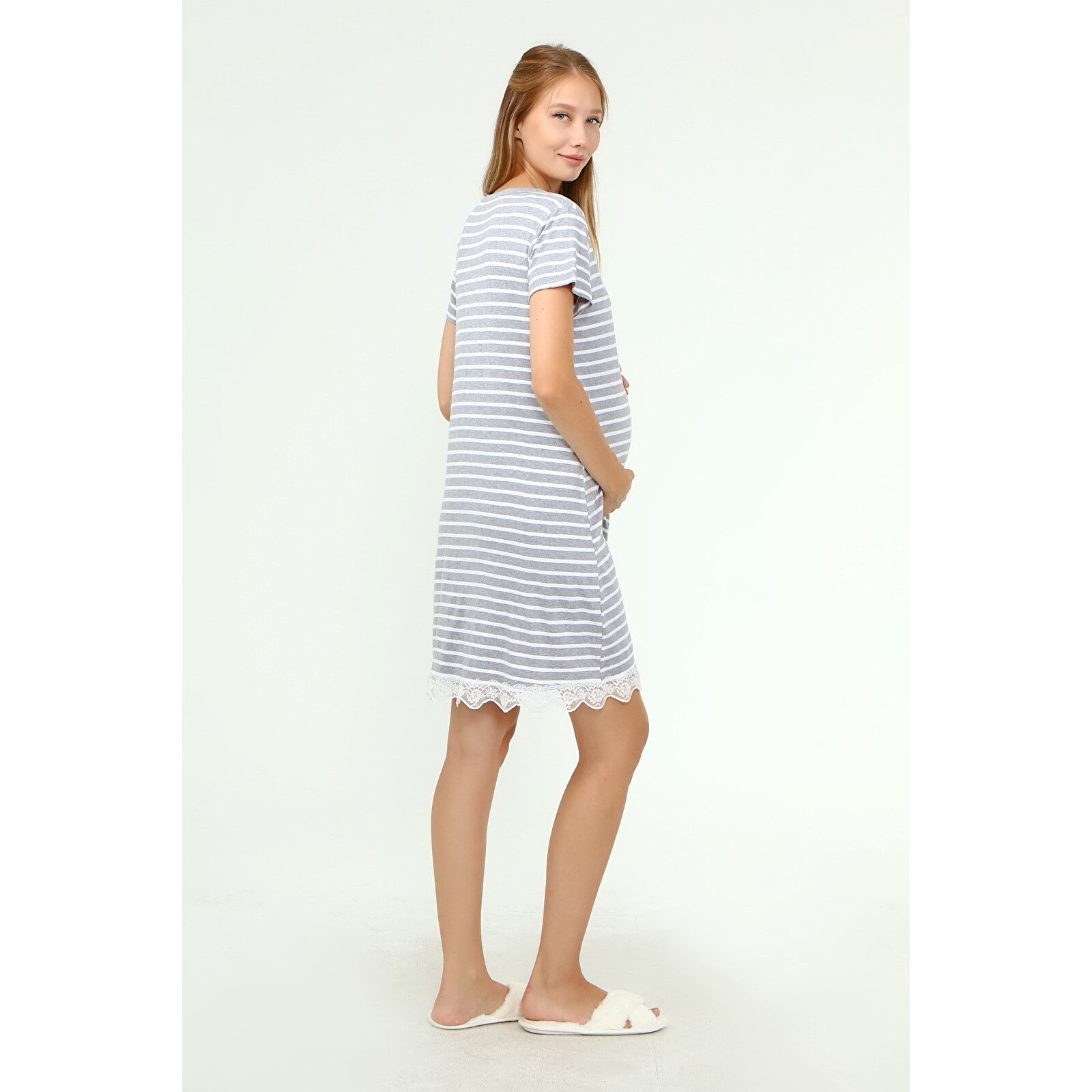GRİ Kadın Düğmeli Dantelli Cepli Hamile Geceliği
