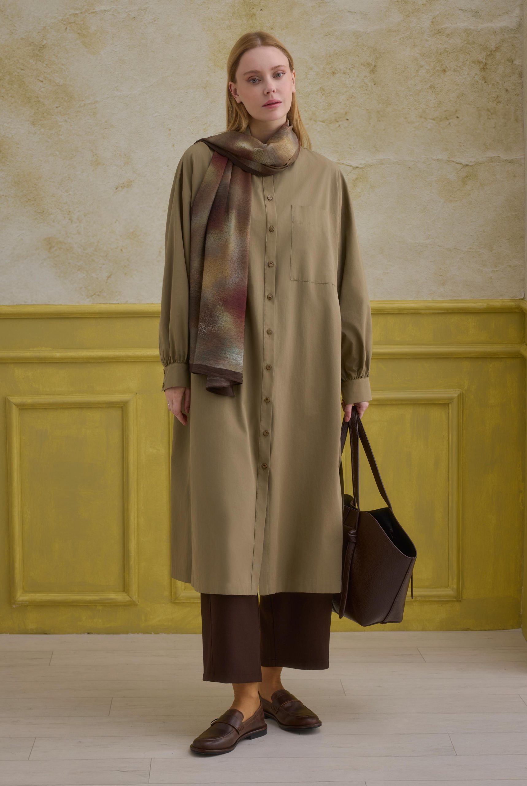 %100 pamuk iplikten üretilen bu hakim yaka uzun tunik, tamamen doğal yapısıyla nefes alabilir, cilde dost bir konfor ve rahatlık sunar. Pamuk lifleri sayesinde gün boyu ferah bir kullanım sağlarken şık bir duruş kazandırır.Kollardaki ince büzgü detayları modele zarif bir hareket ve şık bir ayrıntı ekler. Basic tasarımı sayesinde günlük kombinlerde hem rahat hem de modern bir stil sunar.Kalıp bilgisi: Rahat bir kalıptır; isteğe bağlı olarak daha dökümlü durmasını istemeyenler bir beden küçük tercih edebilir.Bakım önerisi: 30°C’de benzer renklerle yıkayınız. Ağartıcı kullanmayınız. Düşük ısıda ütüleyiniz.Boy: 117 cm (Ürün boyu üretimler arası 1-5 cm değişebilir.)Kalıp Bilgisi:GöğüsBasen Kol Boyu Pazu 36 Beden: 126 cm 130 cm 50,5 cm 48 cm 38 Beden:130 cm 134 cm 51 cm 49 cm 40 Beden: 134 cm 138 cm 51,5 cm 50 cm 42 Beden: 138 cm 142 cm52 cm 51 cm Manken Ölçüleri:Boy: 176 cmGöğüs: 80 cmBel: 60 cmBasen: 90 cmMankenin Üzerindeki Beden: 36