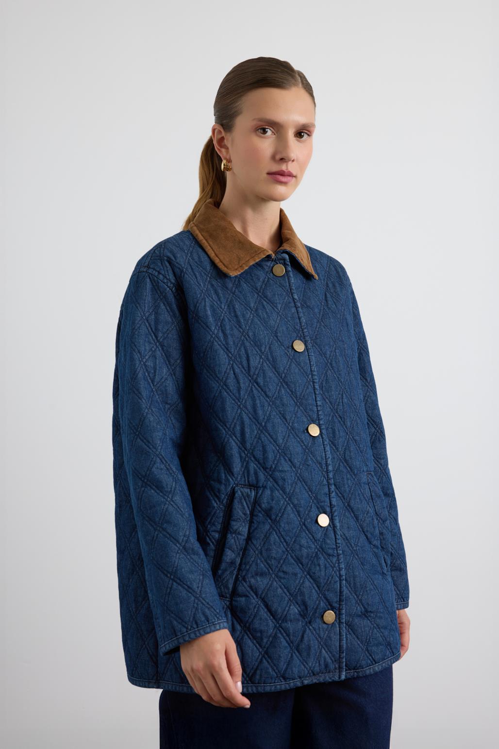 ÜRÜN ÖZELLİKLERİÜrün Tipi: Kapitone Ceket/MontKumaş: Baklava desenli dolum denim kumaşYaka: Kadife yaka garniliCep: Fileto cepliKapama: Antik gold düğme kapama detaylı