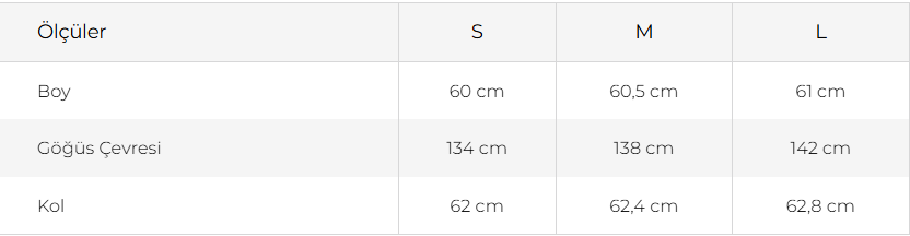 Not: Verilen ölçüler en küçük bedene aittir, bedenler arasında ortalama 4 cm fark bulunmaktadır.
