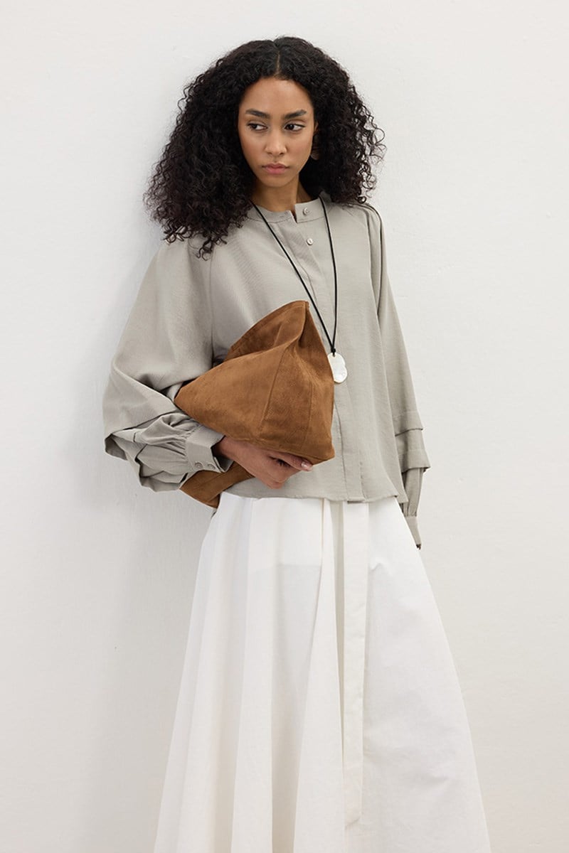 Birit kapama düğmeli, rahat kalıp, yumuşak dokulu özel tasarım süet gömlek.