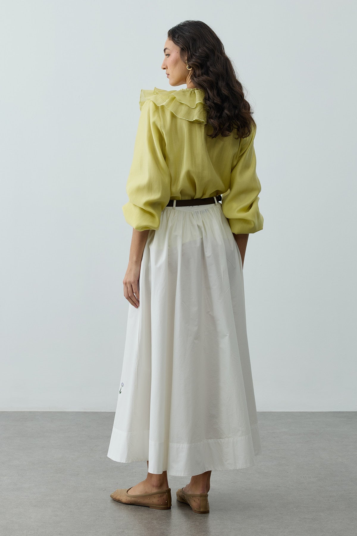% 100 Pamuk dokuma kumaştan, ince kemerli, köprülü, büzgülü, nakış detaylı, etek ucu kalın katlamalı, maxi etek.