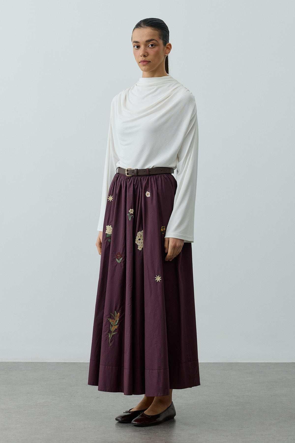 Nakışlı Büzgülü Etek Mürdüm