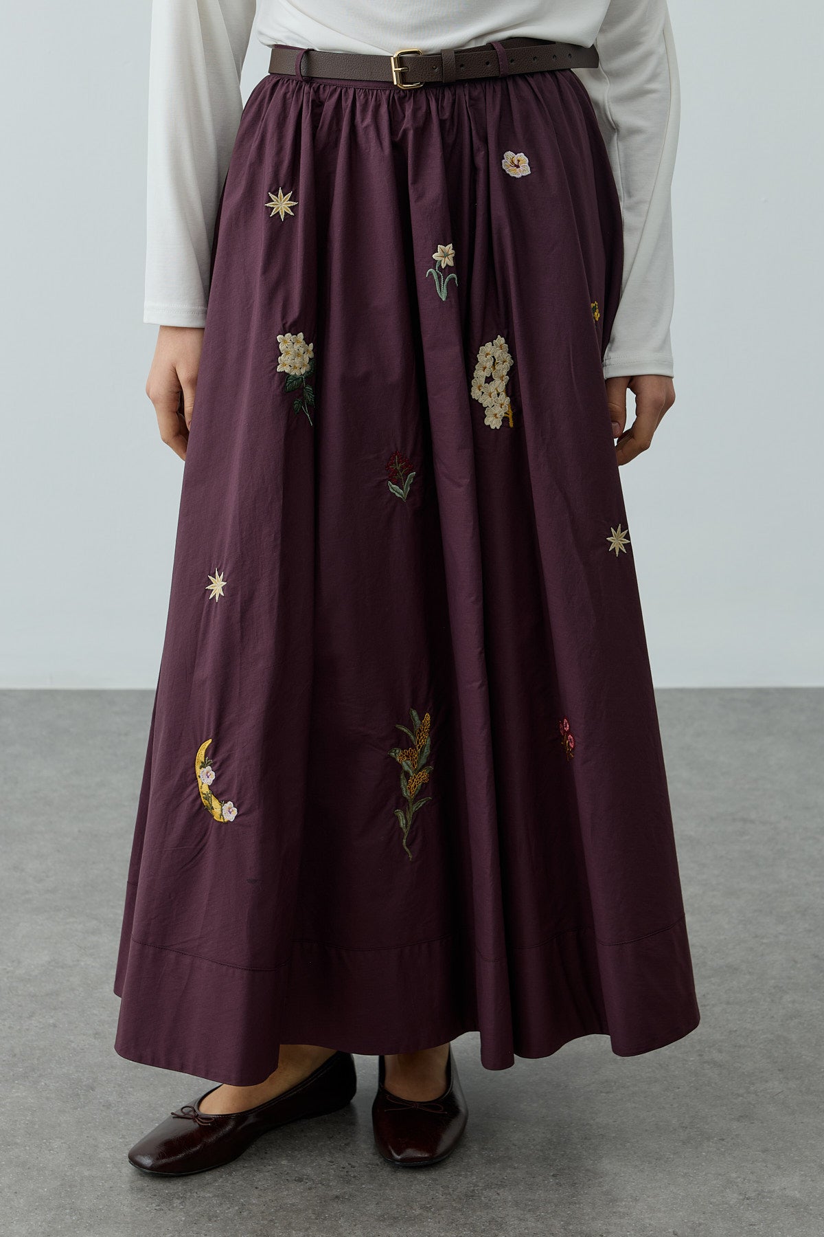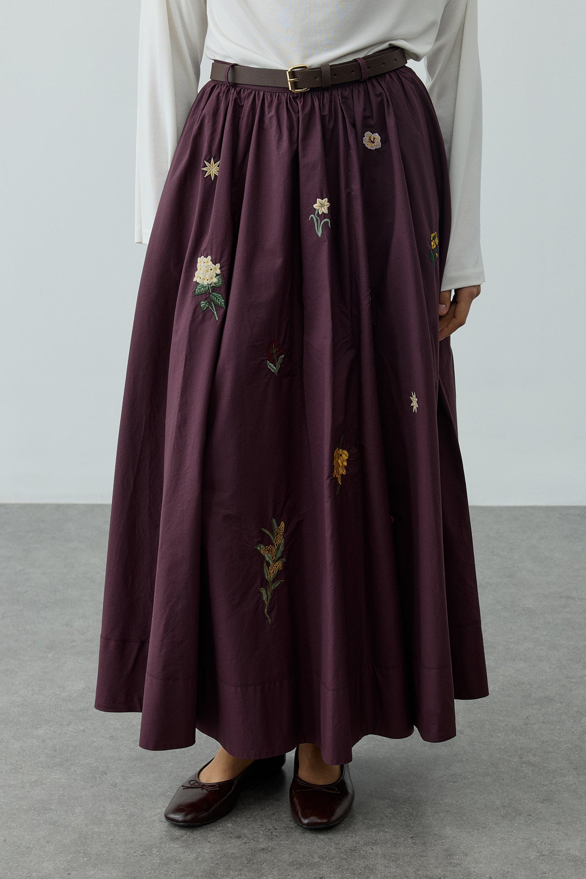 % 100 Pamuk dokuma kumaştan, ince kemerli, köprülü, büzgülü, nakış detaylı, etek ucu kalın katlamalı, maxi etek.