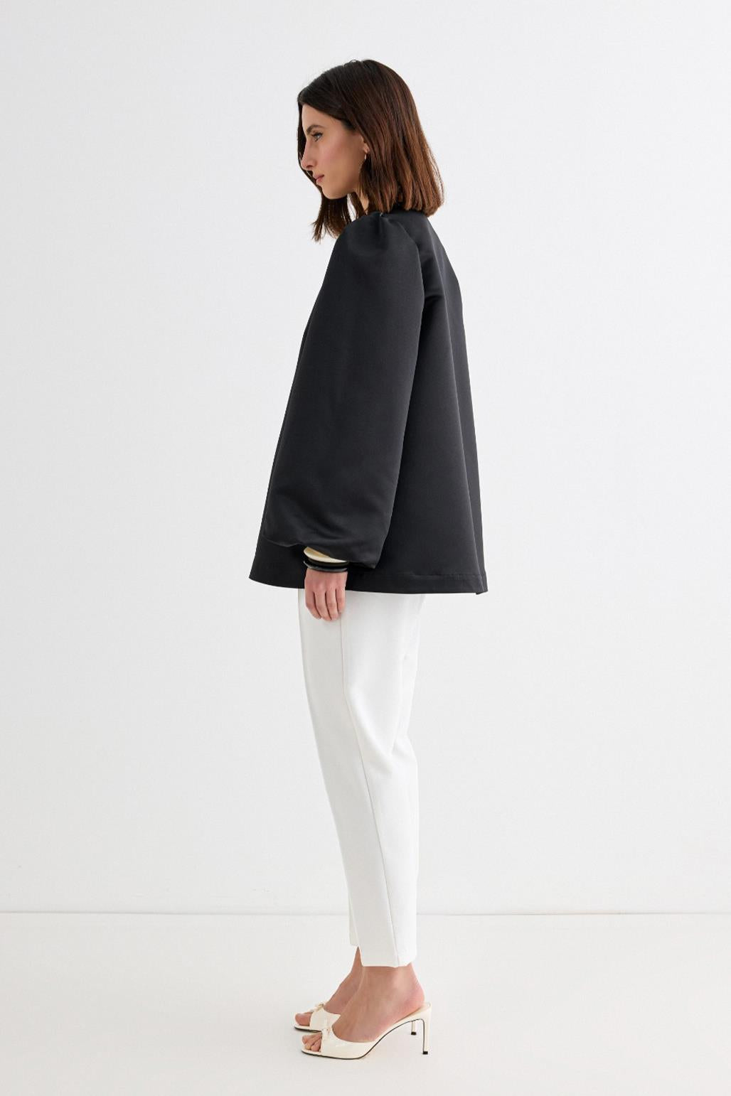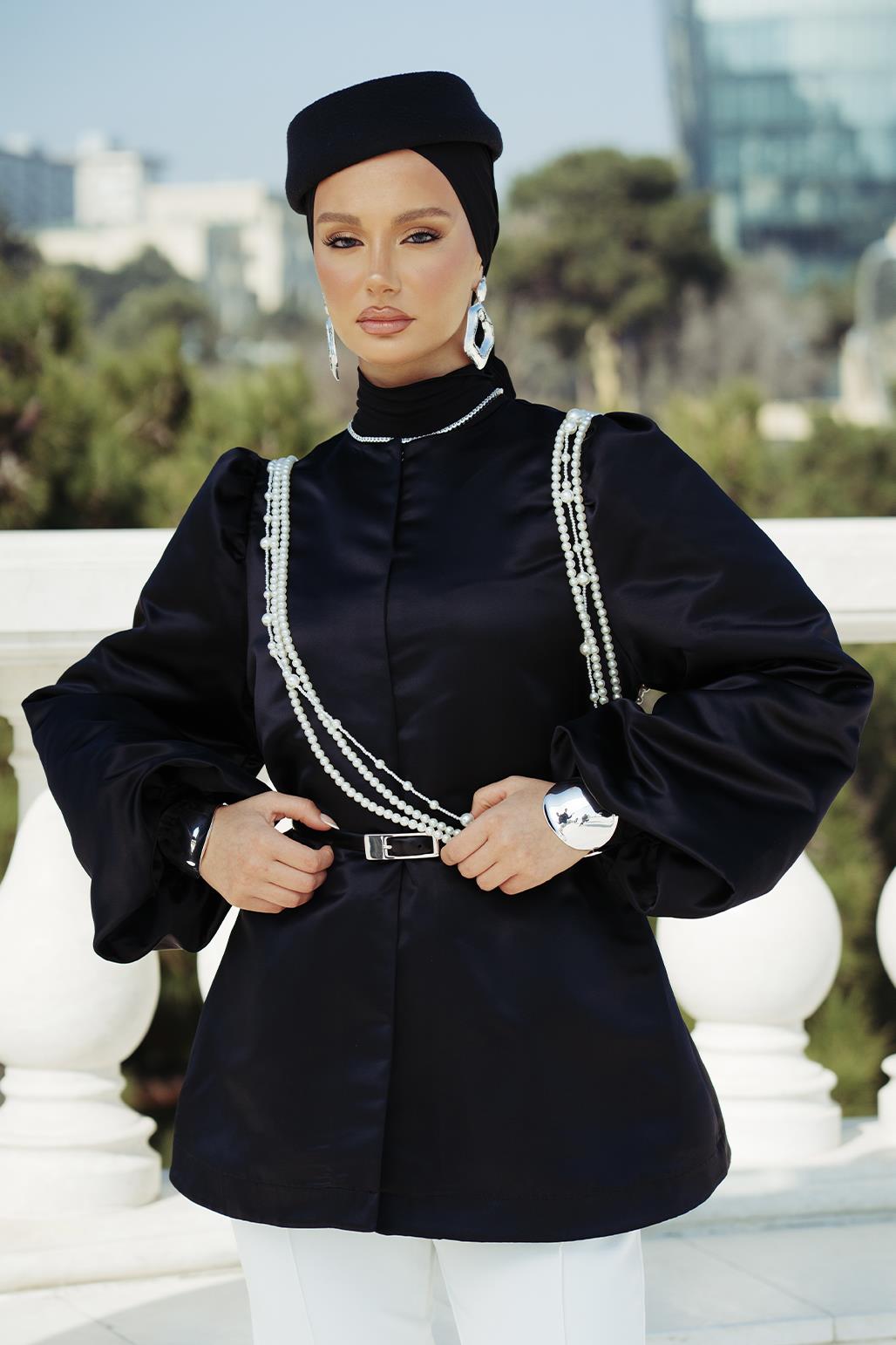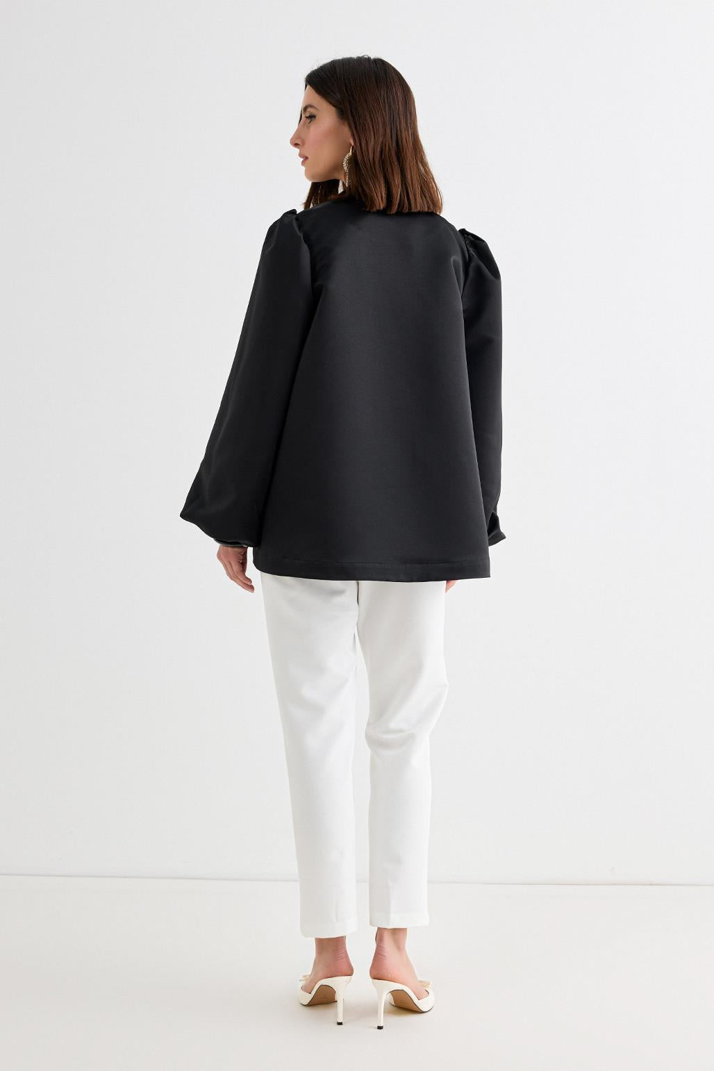 Vera tafta ceket siyah, parlak dokusu ve sofistike tasarımıyla her anınıza zarafet katmak için tasarlandı. Balon kol detayı ve rahat kesimiyle hem dikkat çekici hem de konforlu bir kullanım sunar. Şık bir kemerle belinizi ön plana çıkararak zarif bir görünüm elde edebilir, pantolonlarla modern ve güçlü bir tarz, eteklerle ise feminen ve zarif bir kombin oluşturabilirsiniz. Özel günlerden günlük stilinize kadar her ortamda şıklığınızla fark yaratmanızı sağlayacak çok yönlü bir parça olarak dolabınızda yerini alacak.