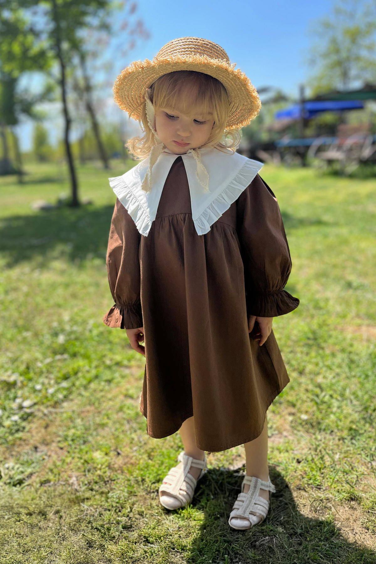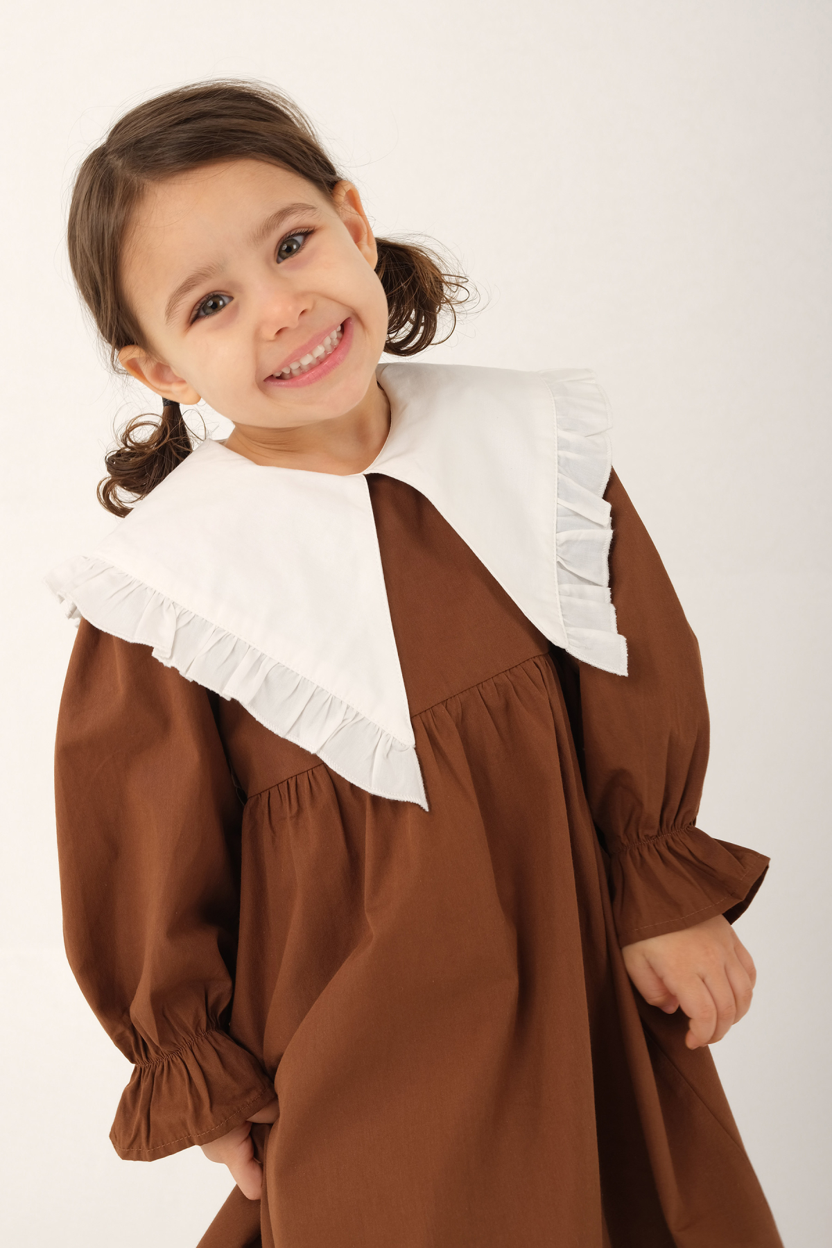 Pamuklu kumaştan üretilmiş, robalı, fırfırlı yakalı ,arkada düğme detaylı, kolları lastik detaylı elbise. Ürünlerimiz bol kalıplara sahiptir. Mankendeki gibi bir duruş için tam yaş aralığını tercih edebilirsiniz.