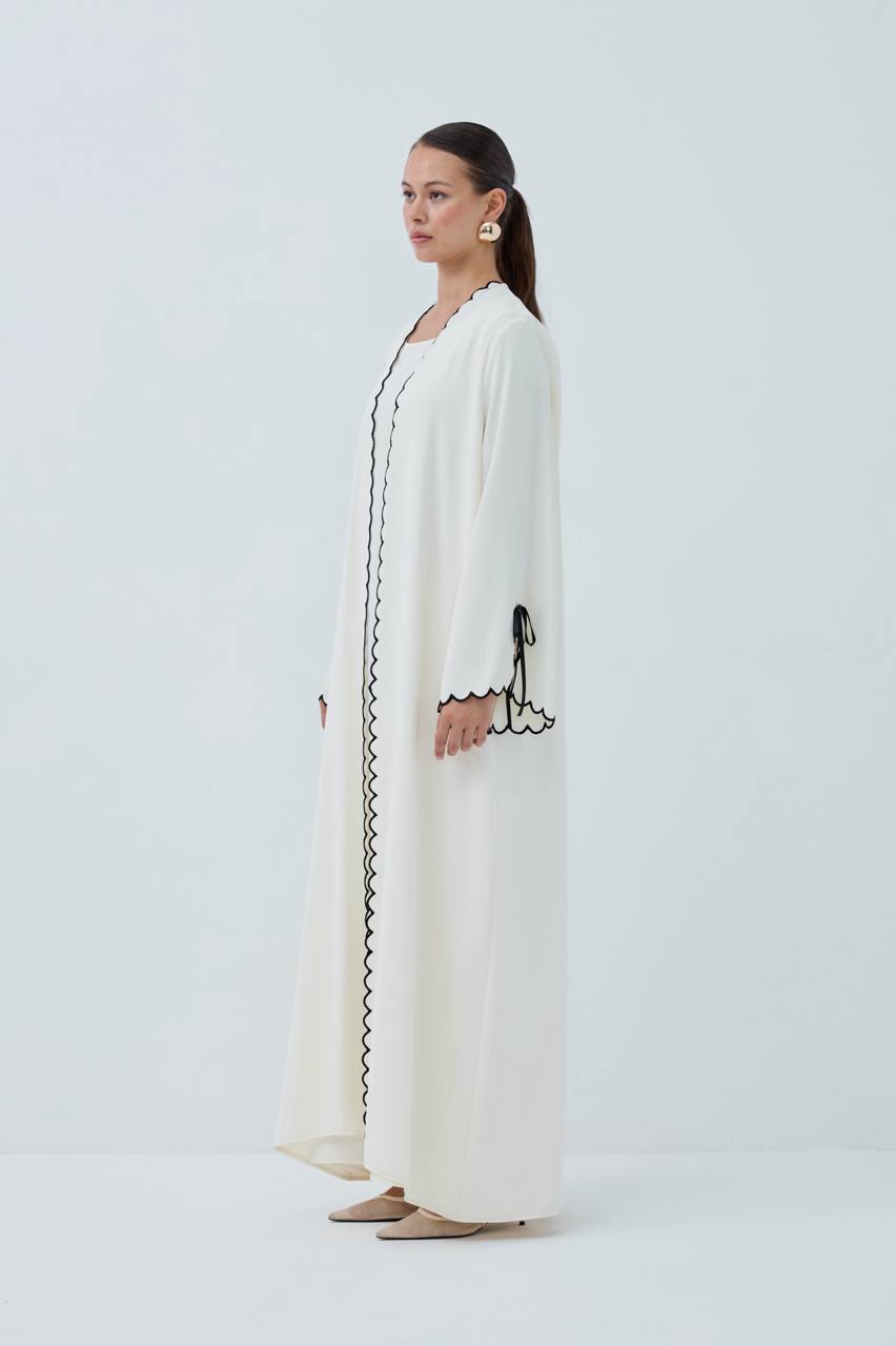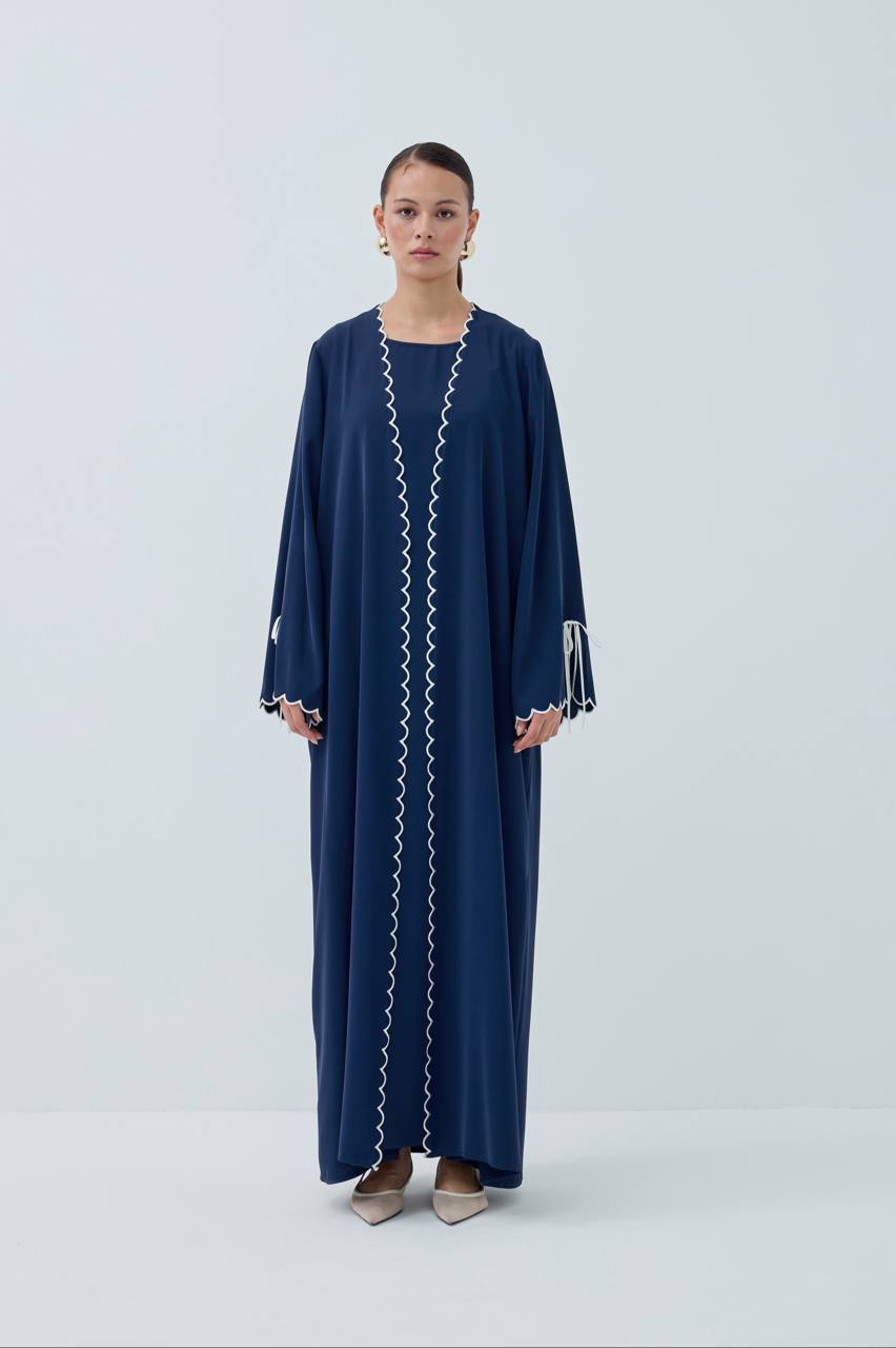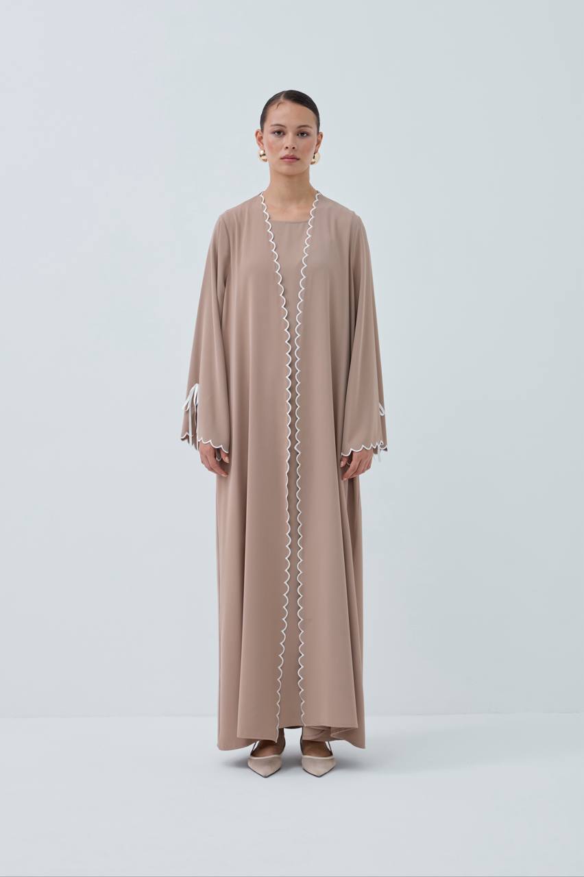 مجموعة أنيقة تختبئ فيها الأناقة في التفاصيل. تميز هذا التصميم الخاص للعباءة بزخارف الشرائط على الأكمام والتطريز على شكل أمواج. مع الفستان البسيط الداخلي، فهي خيار مثالي للاستخدام اليومي وللمناسبات الخاصة. مصممة للنساء اللواتي يبحثن عن أسلوب عصري ومريح وخالد.