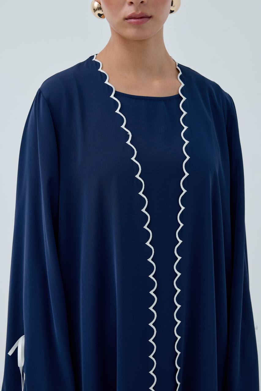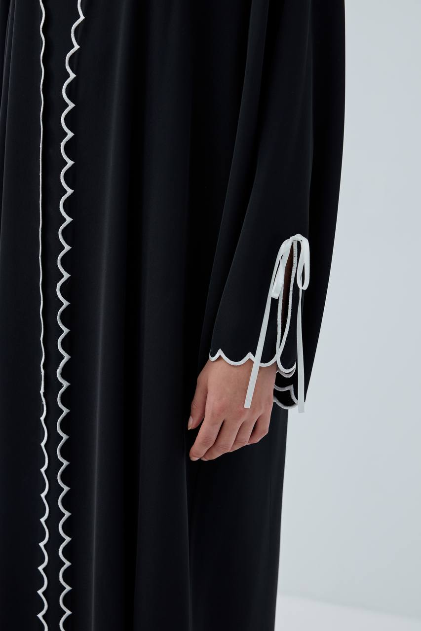 تتميز عباءة هذا التصميم الخاص بتطريزات الشريط على الأكمام وتفاصيل القصات المتموجة. مع الفستان البسيط بداخله، فهي خيار مثالي لكل من الاستخدام اليومي والمناسبات الخاصة. صُممت للنساء اللاتي يبحثن عن أسلوب عصري ومريح وخالد.