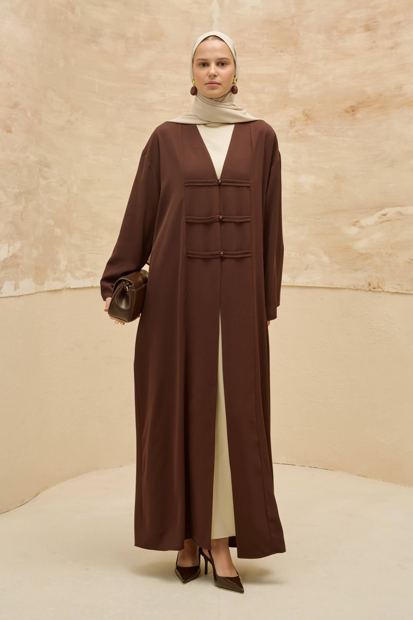 تتميز هذه العباءة بتصميمها البسيط والخالد، حيث تتناغم بسلاسة مع أي إطلالة بفضل خطوطها النظيفة وتفاصيل الأزرار الأنيقة. خيار مثالي للأناقة اليومية والمناسبات الخاصة.