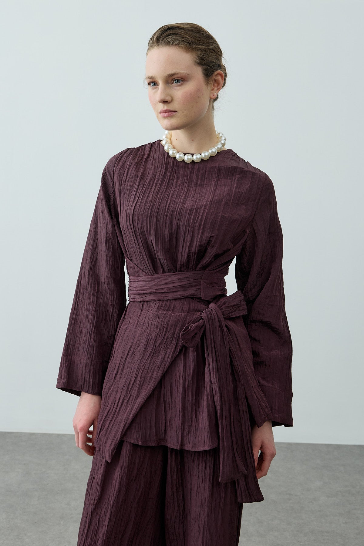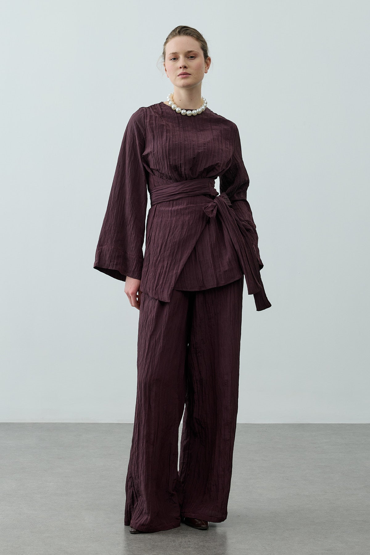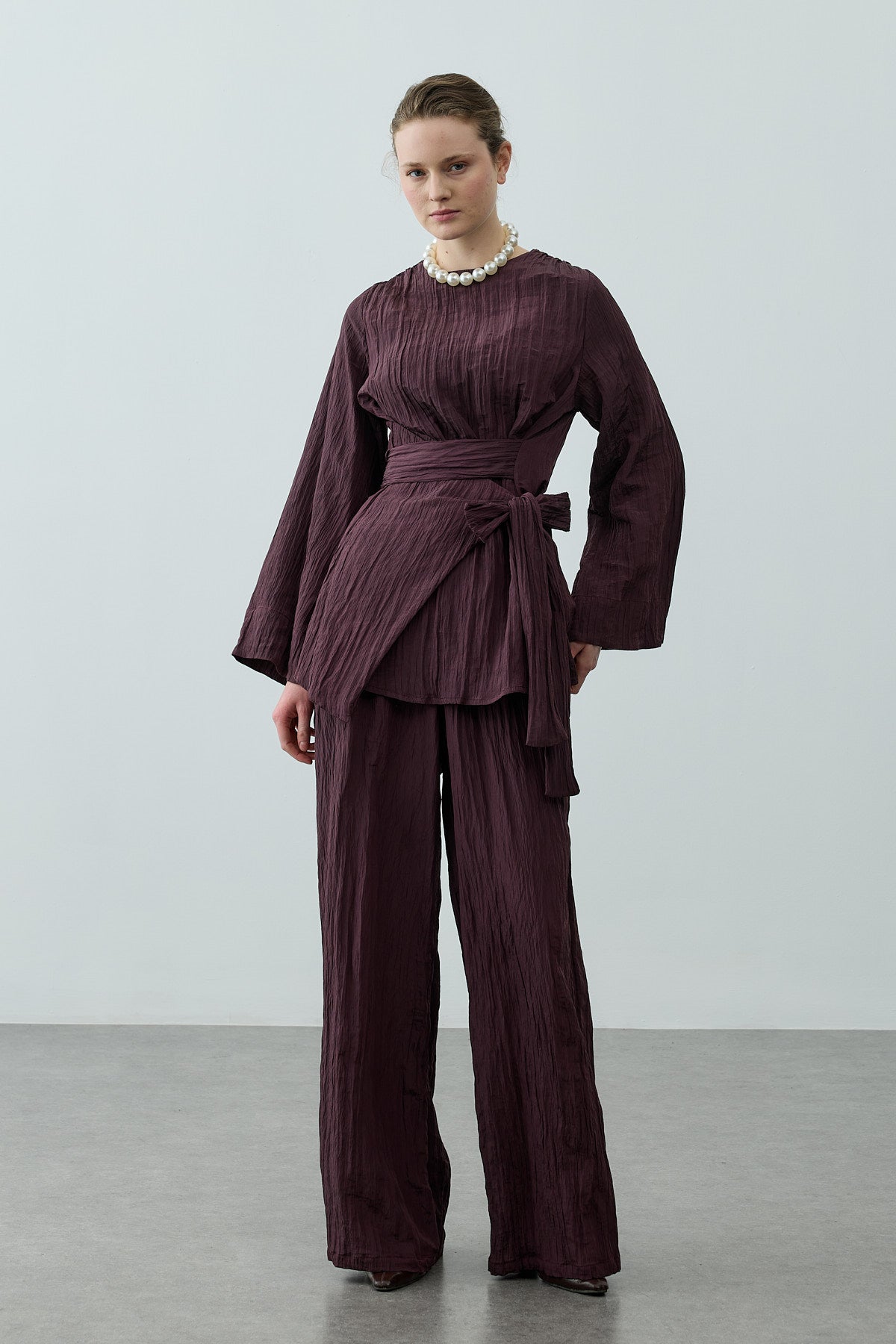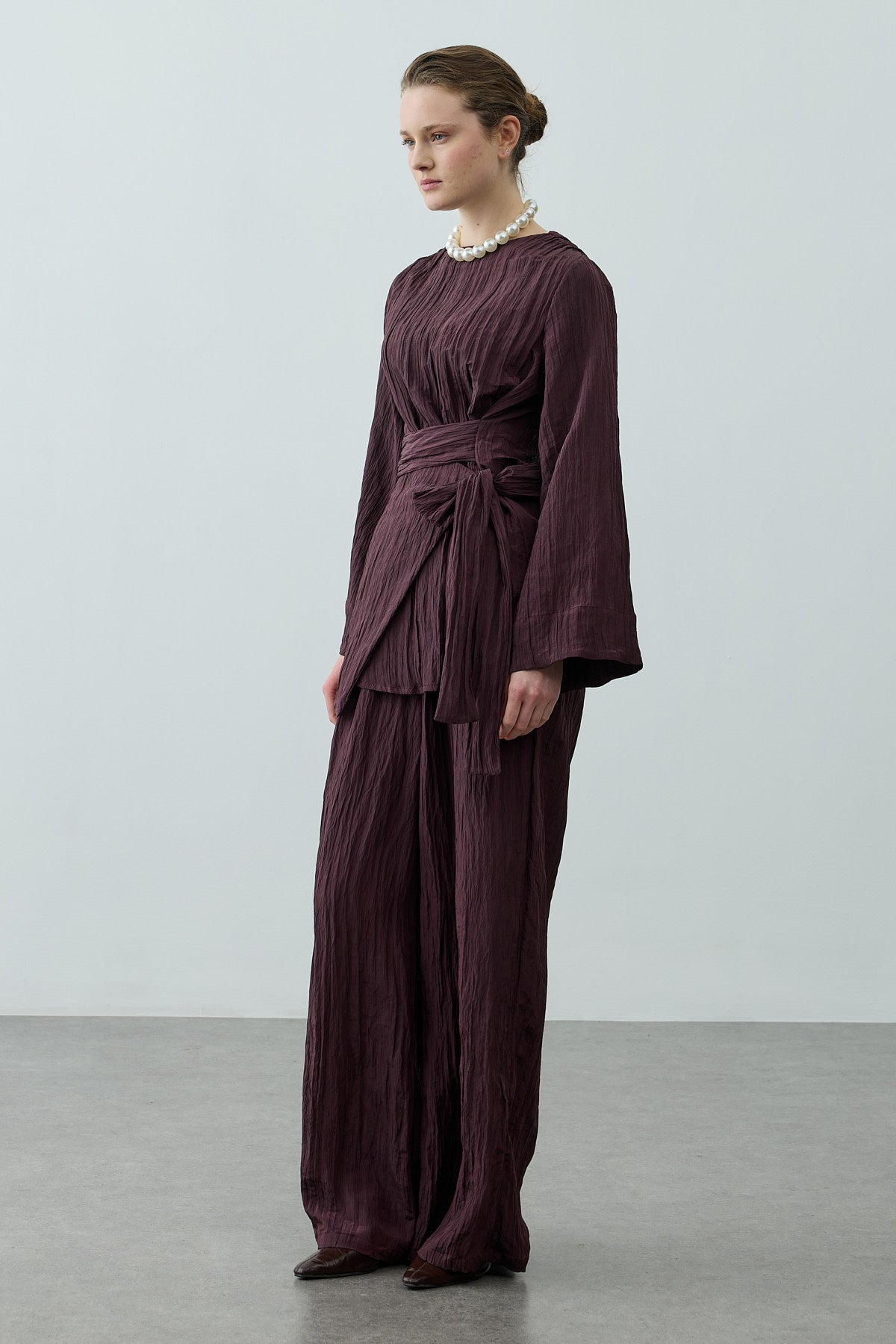 بدلة تتكون من بلوزة مصنوعة من قماش منسوج ذو ملمس لامع مع ياقة دراجة، وسحاب خلفي، وأكمام طويلة، وتفصيل حزام عريض، مرافقة لبنطلون بالازو بقصة واسعة مع جيوب وخصر مطاطي.