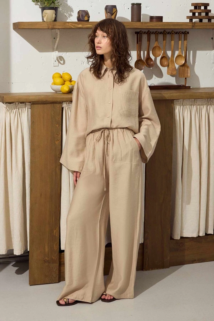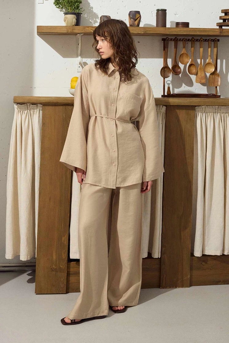 مميزات بدلة البنطال المريحة بلون الحجر بتفاصيل الخياطة: ياقة قميص، أزرار أمامية، تفاصيل جيوب، تصميم أكمام إسبانية، حزام من نفس القماش، قميص بقصة مريحة، بنطال بخصر مطاطي، مزود بجيوب، خصر قابل للتعديل بحبل، حاشية واسعة، قياس عادي، بدلة بنطال بتفاصيل خياطة. محتوى القماش وتعليمات العناية: 91% ليوسيل، 9% بوليستر. اغسل بحد أقصى 30 درجة مئوية على دورة لطيفة. استخدم برامج الغسيل اللطيفة والناعمة. الموديل ترتدي المقاس: S. قياسات الموديل: الطول: 172 سم، الصدر: 78 سم، الخصر: 58 سم، الأرداف: 86 سم