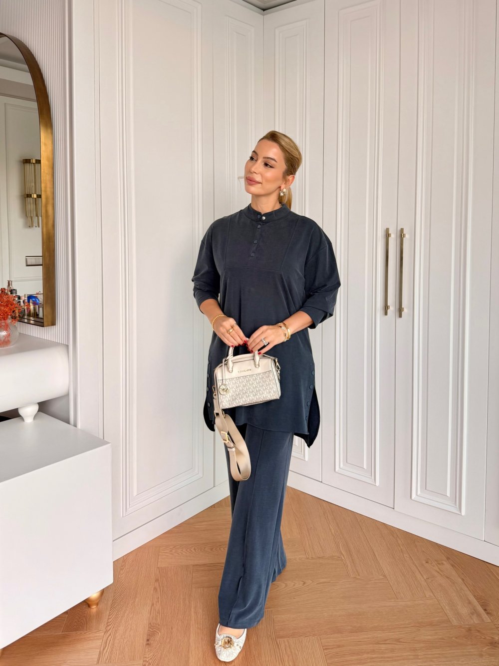 البدلة مصنوعة من قماش أويشو. تتميز البدلة بتفاصيل أزرار كبس عند الياقة. البدلة ذات ياقة دائرية. جوانب البدلة بها تفاصيل شقوق. بنطال البدلة مزود بخصر مطاطي. طول أمامي لبلوزة البدلة: 81 سم، الطول الخلفي: 87 سم، الكتف: 55 سم، الصدر: 55 سم. طول بنطال البدلة: 105 سم، الخصر: 36 سم