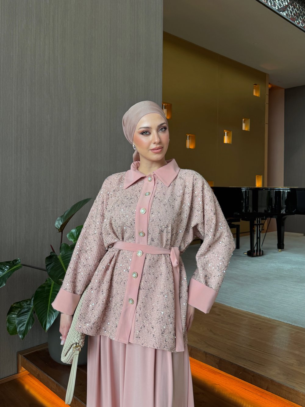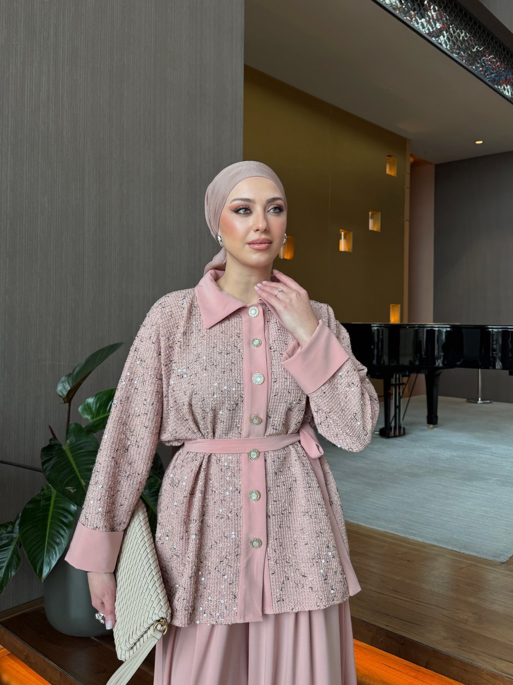 طقم السترة المزدوج هذا بتفاصيله الأنيقة هو خيار متعدد الاستخدامات يمكن استخدامه في العديد من المناسبات، من الدعوات الخاصة إلى الأناقة اليومية. إنه الخيار المثالي للسيدات اللواتي يرغبن في الظهور بأناقة مع الشعور بالراحة. باهتمامه الدقيق بالتفاصيل ووقفته الراقية، يصبح الخيار الأمثل لمن يرغبن في الظهور بأناقة في كل مكان. هذا الطقم مع السترة، الذي يمكن الانتقال به بسهولة من النهار إلى الليل، يصبح قطعة المنقذ في خزانة ملابسك.