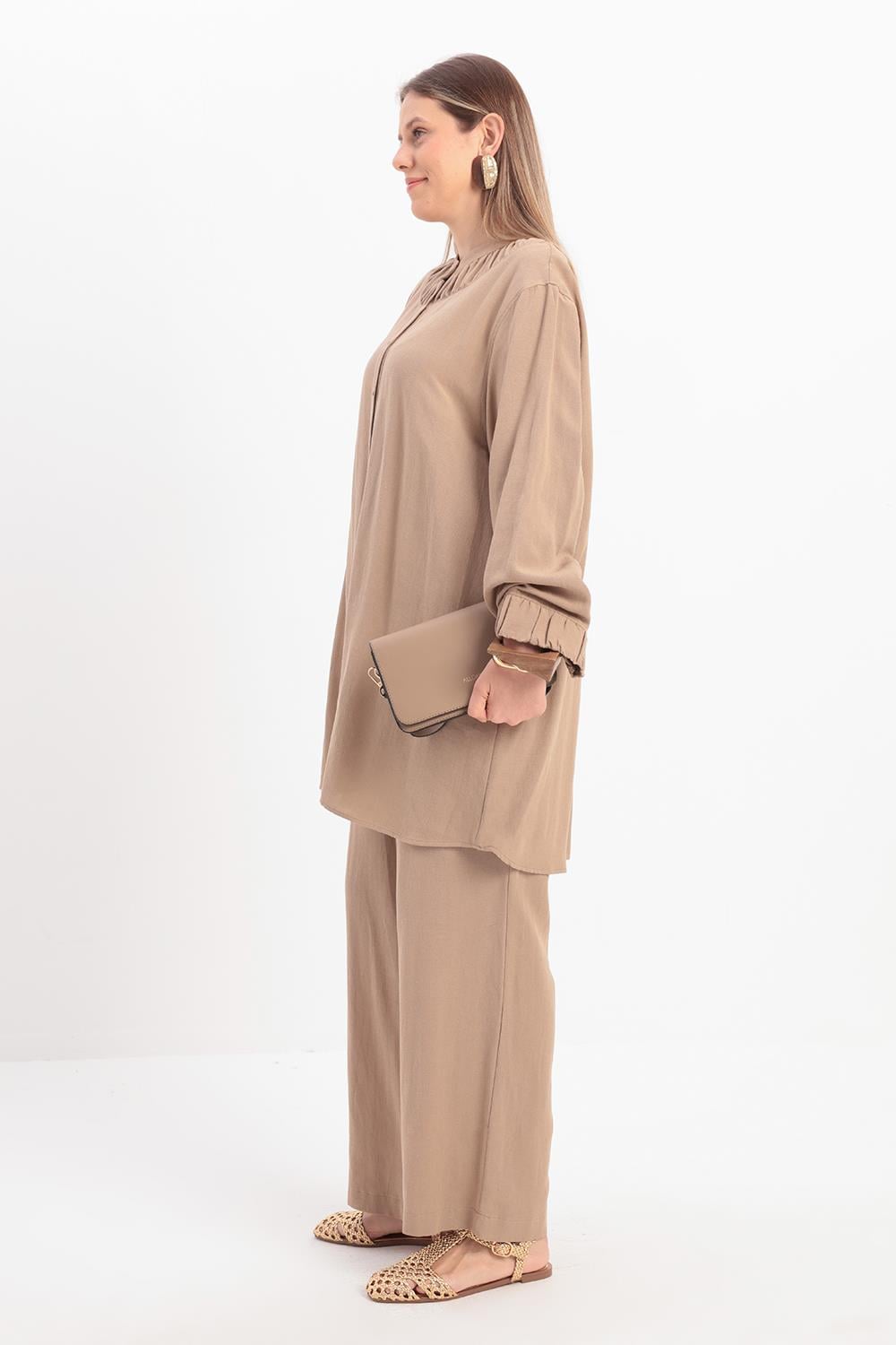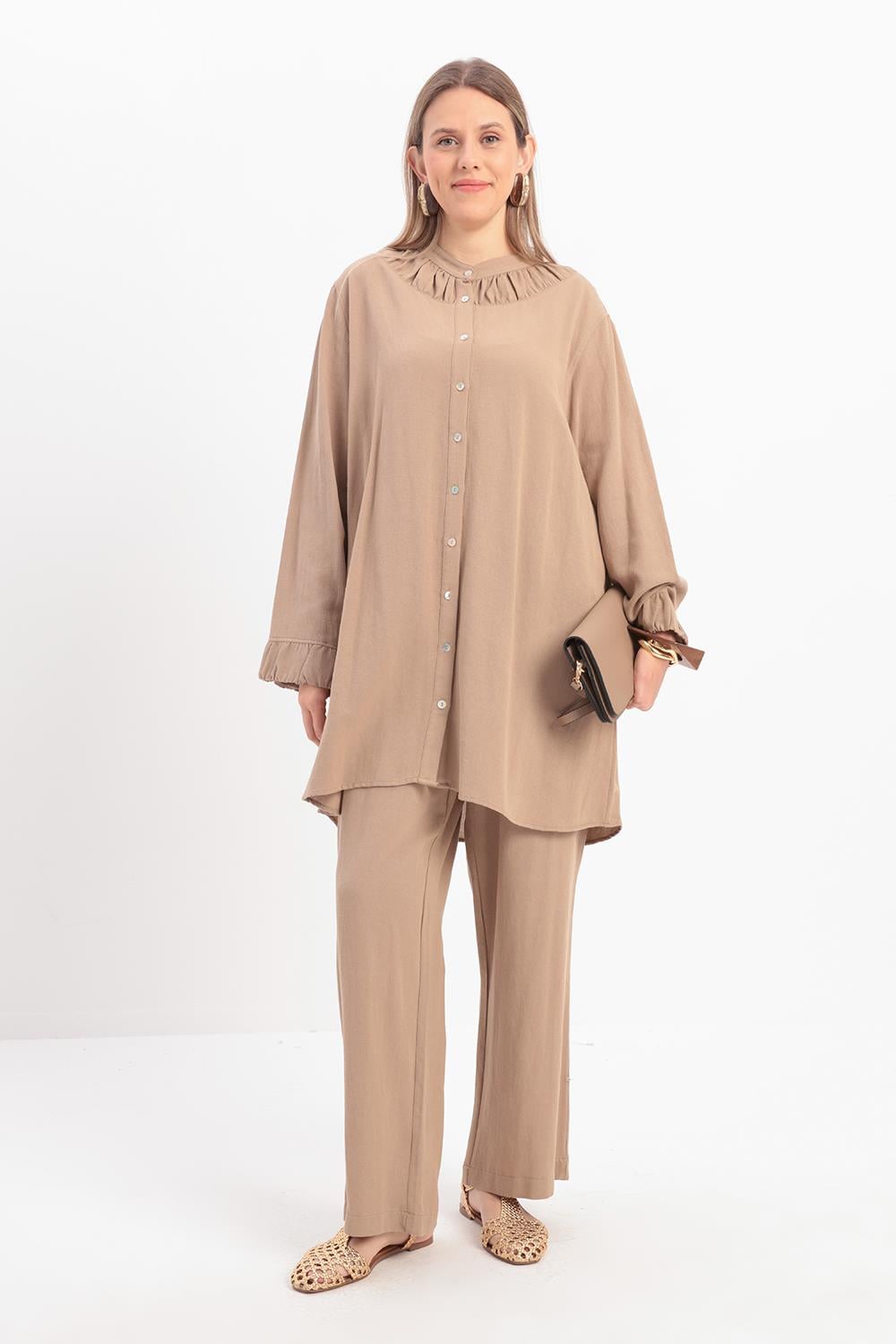 يتميز هذا الطقم بتناغم خطوط التونيك والبنطلون، حيث تضيف تفاصيل جيوب التطريز لمسة راقية للتصميم البسيط. قماشه المتدفق يضمن الراحة طوال اليوم، بينما تضيف خطوطه العصرية لمسة قوية وأنيقة للستايل الحضري.