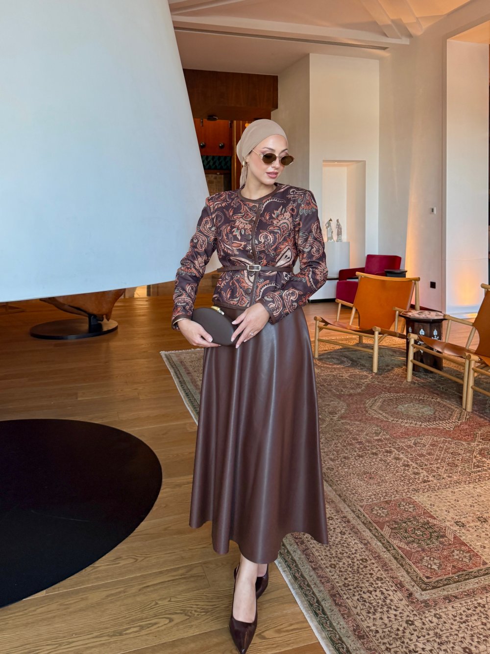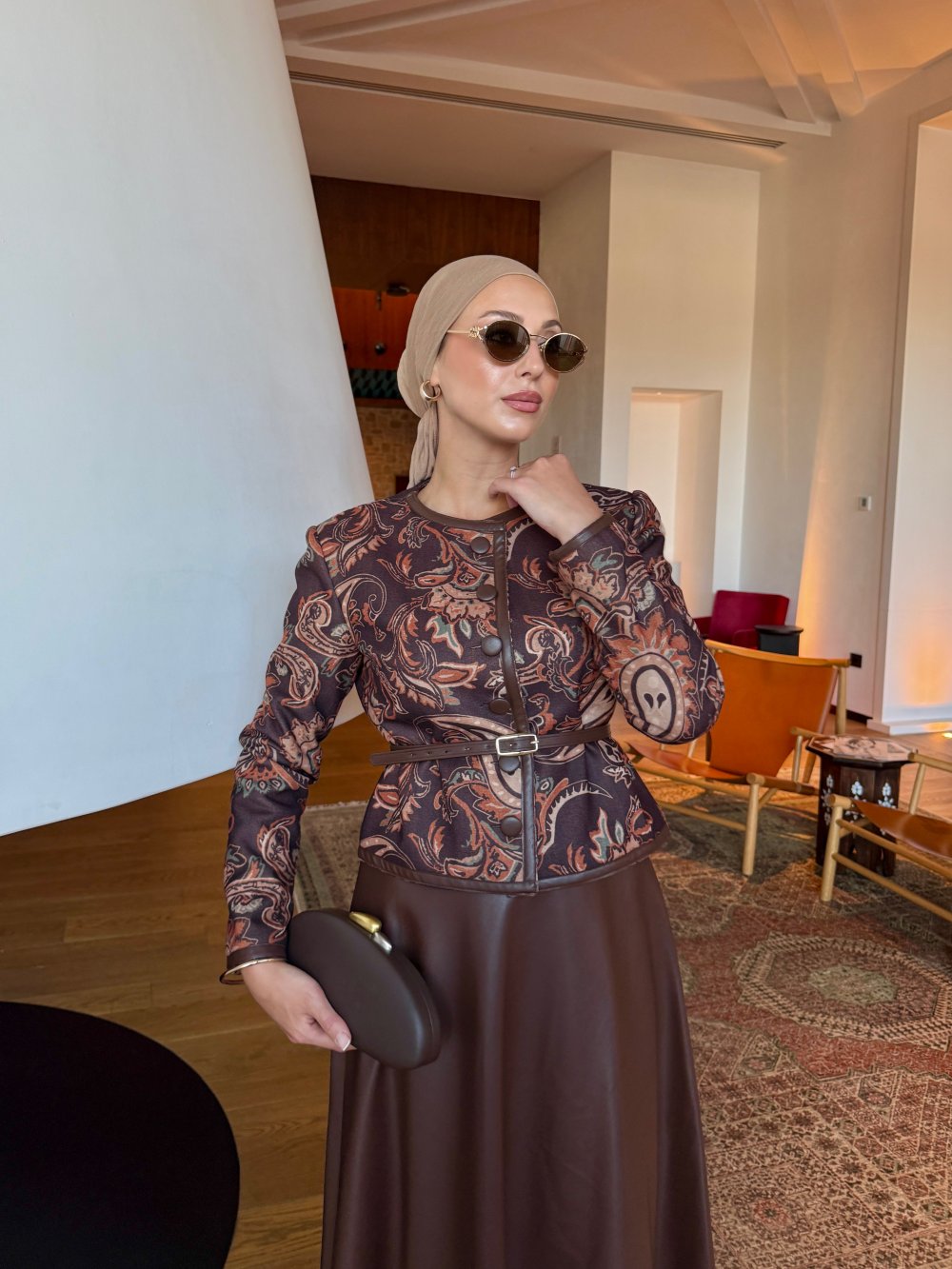 السترة مصنوعة من قماش البوليفيسكوز المناسب للشتاء وتتميز بتصميم مُنقّش. تأتي مزودة بأزرار كاملة وبطانة وحزام. التنورة مصنوعة من قماش الجلد وتحتوي على سحاب جانبي. مقاسات السترة: الطول 52 سم، الكتف 42 سم، الصدر 49 سم. مقاسات التنورة: الطول 93 سم، الخصر 37 سم.