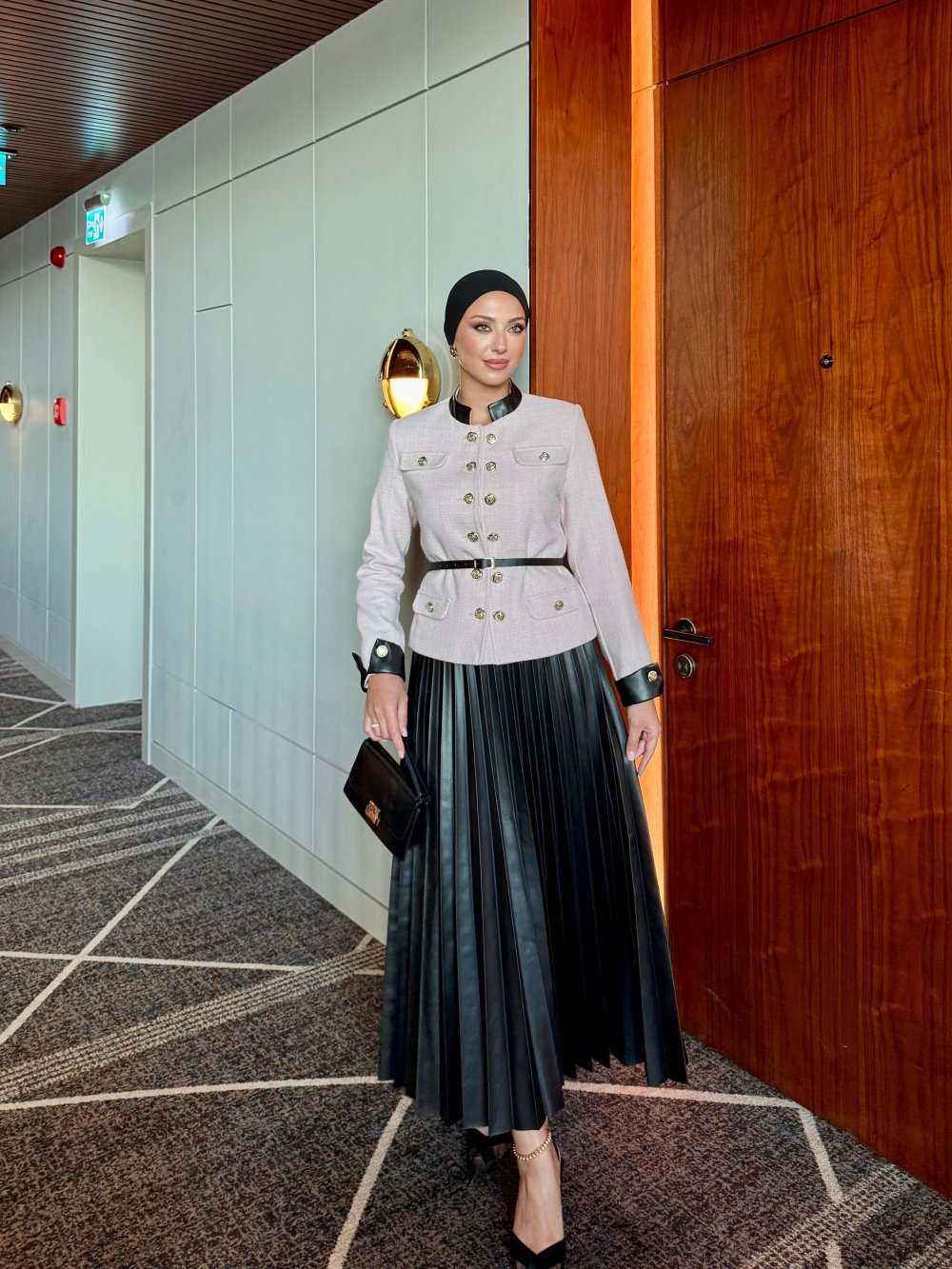 طقم السترة المزدوج هذا بتفاصيله الأنيقة هو خيار متعدد الاستخدامات يمكن استخدامه في العديد من المناسبات، من الدعوات الخاصة إلى الأناقة اليومية. إنه الخيار المثالي للسيدات اللواتي يرغبن في الظهور بأناقة مع الشعور بالراحة. باهتمامه الدقيق بالتفاصيل ووقفته الراقية، يصبح الخيار الأمثل لمن يرغبن في الظهور بأناقة في كل مكان. هذا الطقم مع السترة، الذي يمكن الانتقال به بسهولة من النهار إلى الليل، يصبح قطعة المنقذ في خزانة ملابسك.