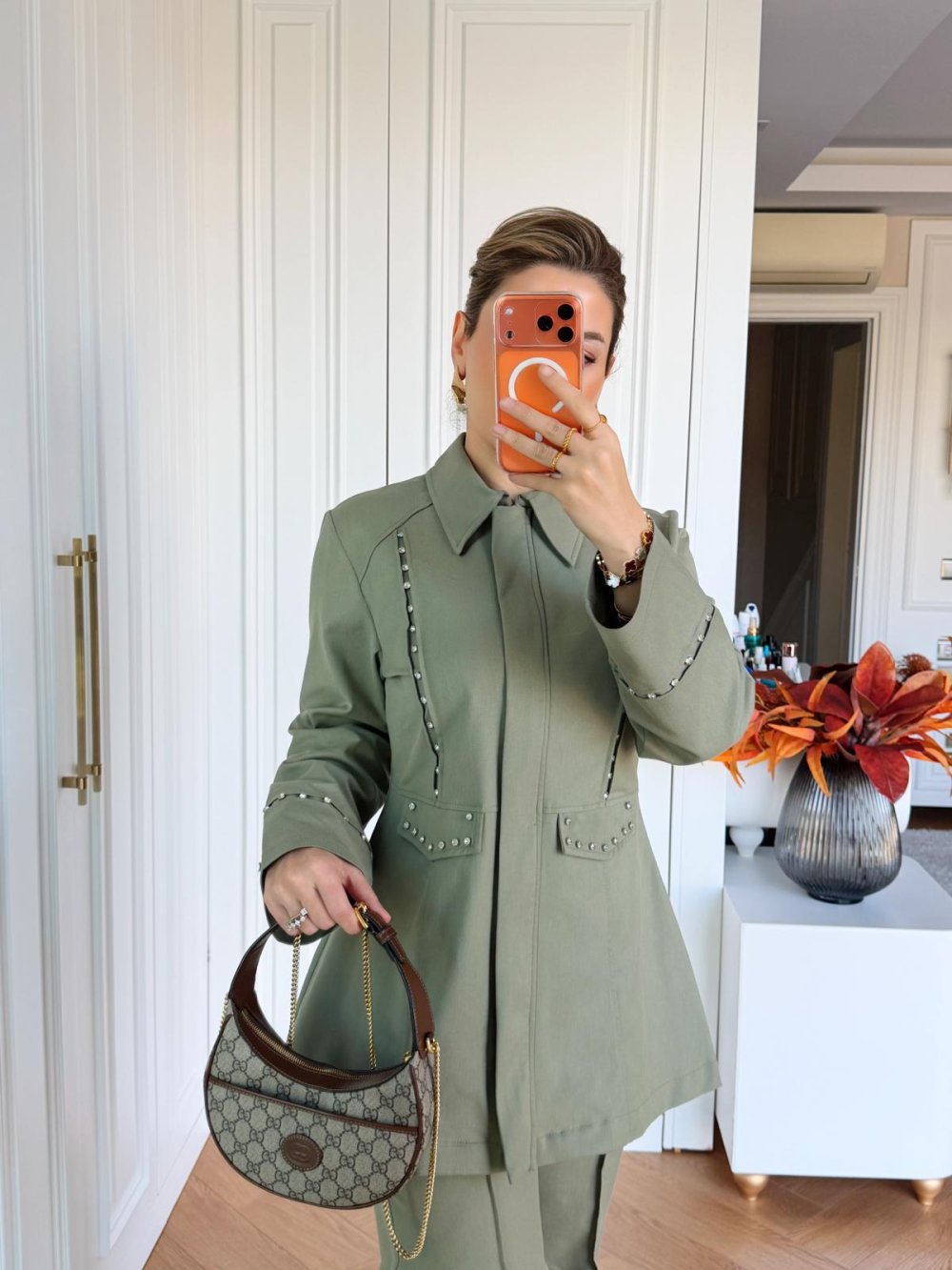 البدلة مصنوعة من قماش الجبردين المطاطي المحتوي على ليكرا. السترة مزودة بسوستة أمامية مخفية وأحجار زخرفية على الأكمام والمقدمة. المجموعة تتضمن حزام قابل للفصل. البنطلون مزود بشريط مطاطي في الخصر وتصميم واسع من الأسفل. المقاسات: طول السترة 75 سم، الصدر 52 سم، الخصر 48 سم، الكتف 42 سم. خصر البنطلون 45 سم، الطول 106 سم.