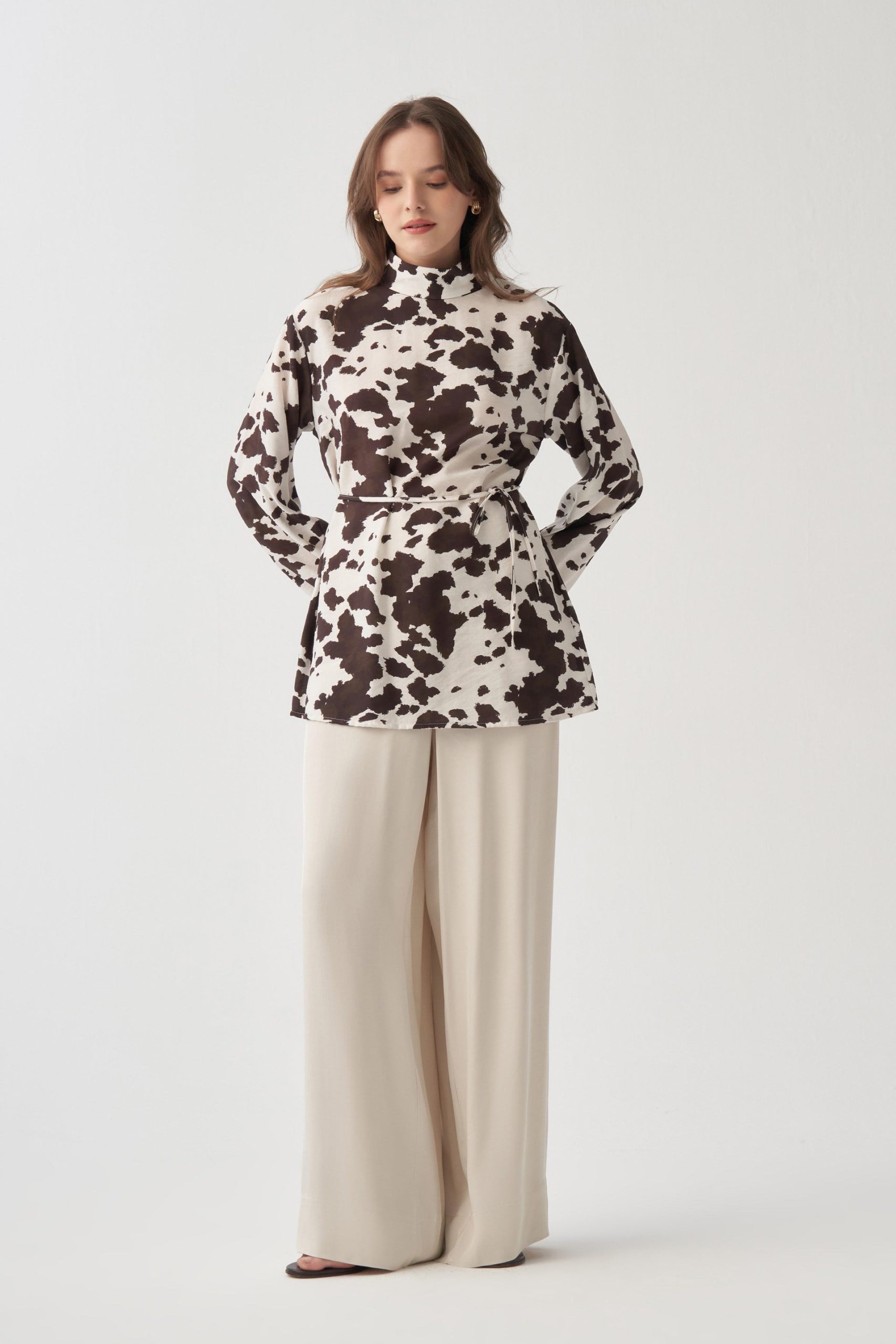 تونيك بياقة وشاح وتفاصيل تجميع – بني